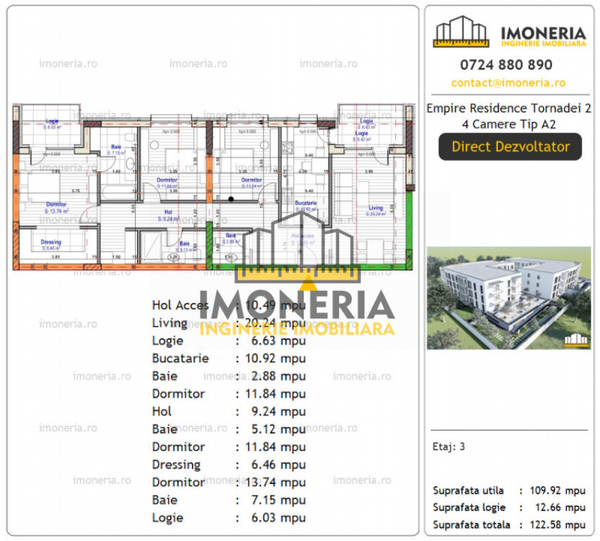Cauți un apartament cu adevărat generos, modern și bine compartimentat, într-o zonă liniștită, dar aproape de tot ce contează? Acest apartament de 4 camere, parte din proiectul Empire Residence Tornadei 2, îți oferă confortul unei locuințe ample, gândită în detaliu pentru o familie care își dorește spațiu real, funcționalitate și calitate. Empire Residence Tornadei 2 continuă standardul ridicat al proiectului Empire Tornadei 1, deja finalizat și locuit, confirmând seriozitatea și atenția la detalii a dezvoltatorului. Într-o zonă rezidențială curată, cu regim mic de înălțime, proiectul oferă locuințe complet decomandate, finisate modern și conectate excelent la zona 1 Decembrie 1918 – Titan. ???? Despre apartament Compartimentat excelent și proiectat pentru confortul unei familii, apartamentul oferă: -Dormitor matrimonial cu baie proprie + dressing -3 băi (matrimonială, baie principală, baie secundară) -2 logii cu acces din living și din zona de noapte -Bucătărie separată, lată și eficientă -Holuri largi cu spații de depozitare bine integrate -Camere luminoase și bine proporționate, ideale pentru copii, birou sau oaspeți Spațiul este gândit pentru o familie care își dorește confort, intimitate și zone distincte pentru fiecare membru. ???? Finisaje și dotări premium: -Încălzire prin pardoseală, pentru un confort termic uniform -Centrală proprie în condensare ( Ariston sau echivalent) -Tamplărie PVC tripan Veka – Low E, 4 Seasons, 7 camere -Pardoseli din parchet laminat, gresie și faianță -Uși interioare MDF, ușă metalică de acces otel antiefractie -Balcon / logie finisată cu gresie tip deck și balustradă din sticlă securizată -Preinstalare pentru aer condiționat -Circuit electric independent plita inductie -Contorizare individuală pentru toate utilitățile -Apartamentele se predau complet finisate, gata pentru mobilare și mutare ???? Despre imobil: -Construcție nouă – DS + P + 3E -Structură din beton armat și zidărie tip Porotherm -Zidarie exterioara si intre apartamente : caramida tip Porothem 30 cm -Izolație termică polistiren expandat 15 cm + fațadă placată tip Klinker -Lift modern 6 persoane, finisaje din granit și inox pe casa scării -Parcare subterană ???? Amplasare și avantaje: Ansamblul este amplasat în zona Titan – 1 Decembrie 1918, intr-o zonă rezidențială liniștită, cu străzi noi, trotuare moderne și aer curat, ferită de zgomotul traficului intens. Ai Metroul 1 Decembrie la 13 minute de mers pe jos, iar în proximitate se află: -Stații STB și acces facil către Theodor Pallady -Școli, grădinițe și centre after-school -Supermarketuri și centre comerciale (Auchan, IKEA, Dedeman, Metro, Jumbo, ParkLake Mall) -Farmacii, clinici medicale și servicii locale Locația îți oferă un echilibru perfect între liniște, siguranță și accesibilitate – ideal pentru viața de familie. ???? Avantaje cheie: -4 camere complet decomandate, cu spații generoase și luminoase -Bucătărie separată și lată, cu acces la logie -Dormitor matrimonial cu baie proprie + dressing -3 bai echipate complet -2 logii generoase -Hol cu spații de depozitare -Boxă pe etaj și loc parcare la demisol (achiziție separată) -Construcție nouă, finisaje premium, încălzire prin pardoseală -Zonă liniștită, cu regim mic de înălțime -Comision 0% cumpărător – reprezentăm direct dezvoltatorul -Consultanță completă: tehnică, imobiliară și financiară Nota: Pret 219 000 Euro + TVA | Avans 80% Pret 222 000 Euro + TVA | Avans 50% Pret 227 000 Euro + TVA | Avans 20% ???? Dacă rezonezi cu cele descrise, hai să discutăm detaliile și să programăm o vizionare la fața locului. Reprezentăm dezvoltatorul în mod direct și oferim consultantă completă (tehnică, imobiliară, financiară) — cu comision 0% pentru cumpărător. Id intern: P146014