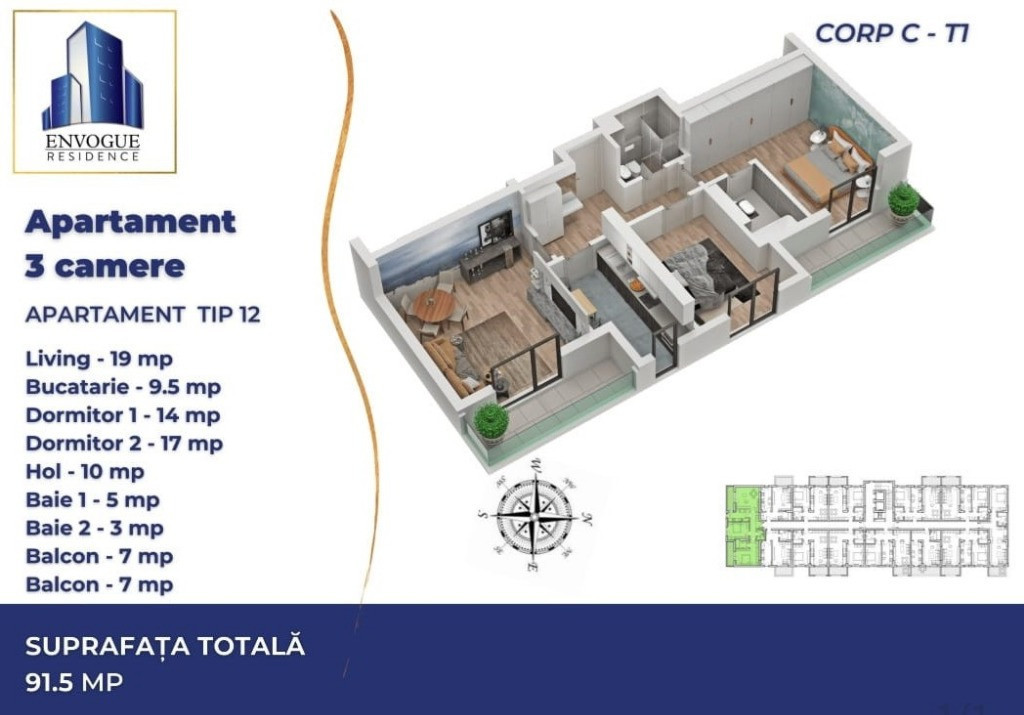 Familia ta s-a mărit și simți că a venit vremea să te muți într-o locuință mai spațioasă? Ce părere ai de acest apartament cu trei camere, amplasat în zona de vest a Capitalei, în ansamblul rezidențial EnVogue Residence - Iuliu Maniu? Locuințele noastre au suprafețe generoase, semnificativ peste media practicată în piață, pe categorii de apartamente, iar proprietatea pe care ți-o propunem aici spre vânzare are o suprafață utilă de 90 metri pătrați. Programând o vizionare, vei descoperi că locuința despre care îți vorbim se distinge prin caracteristicile devenite deja obișnuință pentru clienții EnVogue Residence, anume calitatea și siguranța construcției, alături de finisajele din categoria premium. La suprafața generoasă a acestui tip de apartament se adaugă un alt avantaj pentru potențialii cumpărători, anume compartimentarea sa inteligentă, respectiv faptul că este o unitate locativă decomandată – ceea ce credem că va contribui mult la sporirea confortului tău! PLUS-VALOARE: Ne străduim în permanență să punem la dispoziția clienților noștri cele mai bune oferte financiare, astfel că făcând o achiziție EnVogue Residence - Iuliu Maniu te vei bucura de următoarele beneficii: • Asistență GRATUITĂ, din partea unui broker de credite profesionist, pentru cei interesați de accesarea unei finanțări bancare. • Reducere de 10% la mobila din magazinul Mobexpert Militari, la cumpărarea oricărei locuințe în cadrul EnVogue Residence - Iuliu Maniu. Aflat în dezvoltare pe Bulevardul Iuliu Maniu, nr. 586-590, în imediata apropiere a stației de metrou Preciziei, EnVogue Residence - Iuliu Maniu aduce pe piață apartamente noi de calitate superioară, cu suprafețe și compartimentări variate – garsoniere, studiouri, apartamente cu două și trei camere, dar și penthouse-uri mai spațioase. Recent finalizată, prima fază de dezvoltare a proiectului (corpul C) cuprinde 169 de unități locative, în vreme ce faza a doua (corpul B) este aflată în derulare și cuprinde 214 apartamente. Locuințele din cadrul proiectului au suprafețe generoase, peste media practicată în mod obișnuit pe acest segment de piață, în vreme ce dotările și finisajele se încadrează în categoria premium, tocmai pentru a furniza rezidenților acel plus de confort pe care și-l doresc în propriile case. Dovadă a atenției deosebite acordate siguranței și confortului locatarilor, fiecare bloc din cadrul ansamblului EnVogue Residence - Iuliu Maniu include propriul adăpost de protecție civilă, amplasat la subsolul clădirii. De asemenea, dezvoltatorul a început deja instalarea de panouri fotovoltaice în cadrul proiectului, astfel că viitorii rezidenți se vor putea bucura de confortul și beneficiile unei surse de energie regenerabilă. Specificații și facilități: • Regim de înălțime de la 10 etaje • Fundație de tip radier general, cu 2 subsoluri • Structură pe cadre de beton • Adăpost de protecție civilă pentru fiecare bloc • Panouri fotovoltaice • Certificat de performanță energetică de clasa A • Compartimentări interioare din cărămidă Porotherm • Izolație exterioară realizată din vată bazaltică și polistiren • Grad ridicat de protecție ignifugă • Sistem de termoizolație și hidroizolație de la Sika pentru terase • Spații verzi și zonă de promenadă • Locuri de joacă pentru copii • Spații comerciale, restaurant, sală de fitness, supermarket • Stații de încărcare pentru mașini electrice etc. Despre EnVogue Residence Cu o experiență de circa 9 ani pe piața rezidențială din Capitală și împrejurimi, portofoliul dezvoltatorului autohton EnVogue Residence cuprinde 5 proiecte finalizate și unul aflat în curs de construcție, anume EnVogue Residence - Iuliu Maniu.