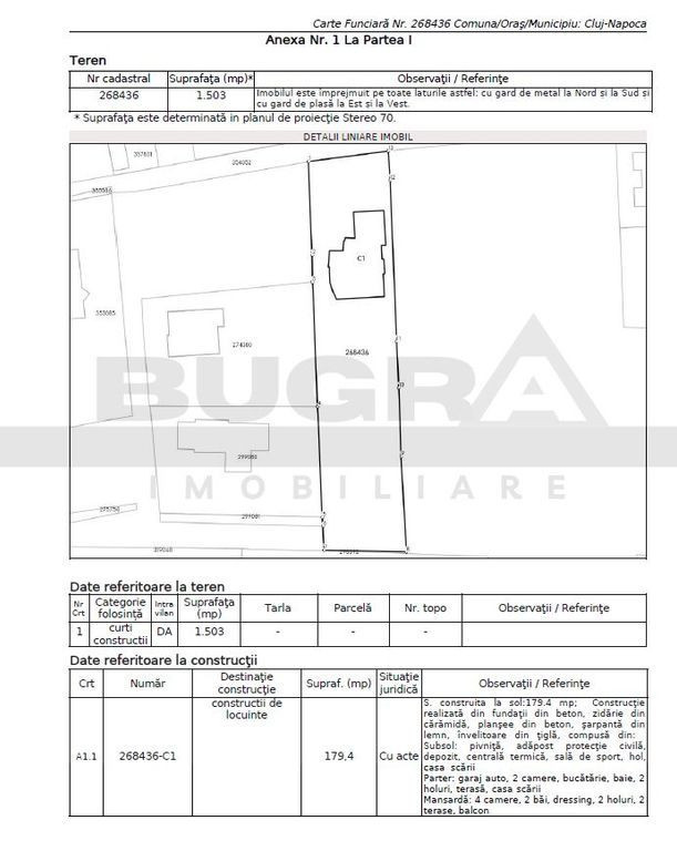 Va oferim spre vanzare, in reprezentare exclusiva, teren intravilan situat in cartierul Zorilor, strada GV Bibescu. Suprafata totala masoara 1503 mp, are front stradal de 17,3 ml. Este incadrat in utr LIU. Pe teren se afla o constructie intabulata, racordata la toate utilitatile. Pentru informatii suplimentare va stam la dispozitie!