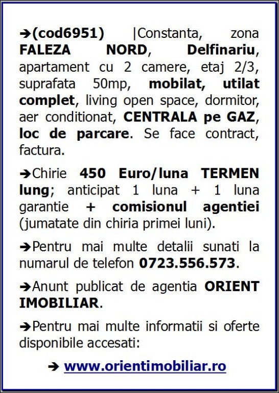 (cod6951) | Constanta, zona FALEZA NORD, Delfinariu, apartament cu 2 camere, etaj 2/3, suprafata 50mp, mobilat, utilat complet, living open space, dormitor, aer conditionat, CENTRALA pe GAZ, loc de parcare. Se face contract, factura. Chirie 450 Euro/luna TERMEN lung; anticipat 1 luna + 1 luna garantie + comisionul agentiei (jumatate din chiria primei luni). Pentru mai multe detalii sunati la numarul de telefon 0723.556.573. Anunt publicat de agentia ORIENT IMOBILIAR.