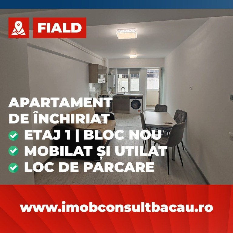 Fii tu primul chirias al acestui apartament modern situate in cartierul FIALD! Ești în căutarea unei locuințe moderne, luminoase și impecabil întreținute? Acest apartament este exact ce ai nevoie! Situat în prestigiosul cartier Fiald, într-un bloc nou, la etajul 1, acest spațiu este disponibil pentru primul chiriaș – totul este nou, curat și pregătit pentru mutare imediată. Dotări și avantaje: - Etajul 1; - Bucătărie complet utilată – cuptor electric modern, plită, hotă și mobilier nou; - Aer condiționat – pentru confort total în sezonul cald; - Loc de parcare privat în fața blocului – inclus în preț; - Amenajări premium – finisaje de calitate, design contemporan, atmosferă aerisită și luminoasă. Zona este una liniștită, dar cu acces facil către punctele de interes din oraș – ideală pentru cei care vor să combine confortul cu eficiența. Se închiriază pe termen lung. Pentru detalii și programări la vizionare: - Corina: 0740 288 297; - Lacramioara: 0758 262 533, sau la sediul agenției noastre, Imob Consult Bacau, situat pe strada Banca Națională nr. 27 la intersecția cu Str. Neagoe Vodă, langa Irish Pub.