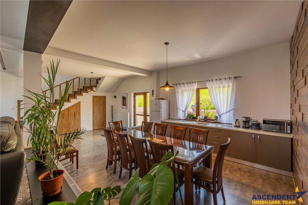 - La parter 2 livinguri generoase de 100 mp utili open space cu bucatarie, loc de servit masa si zona de recreere