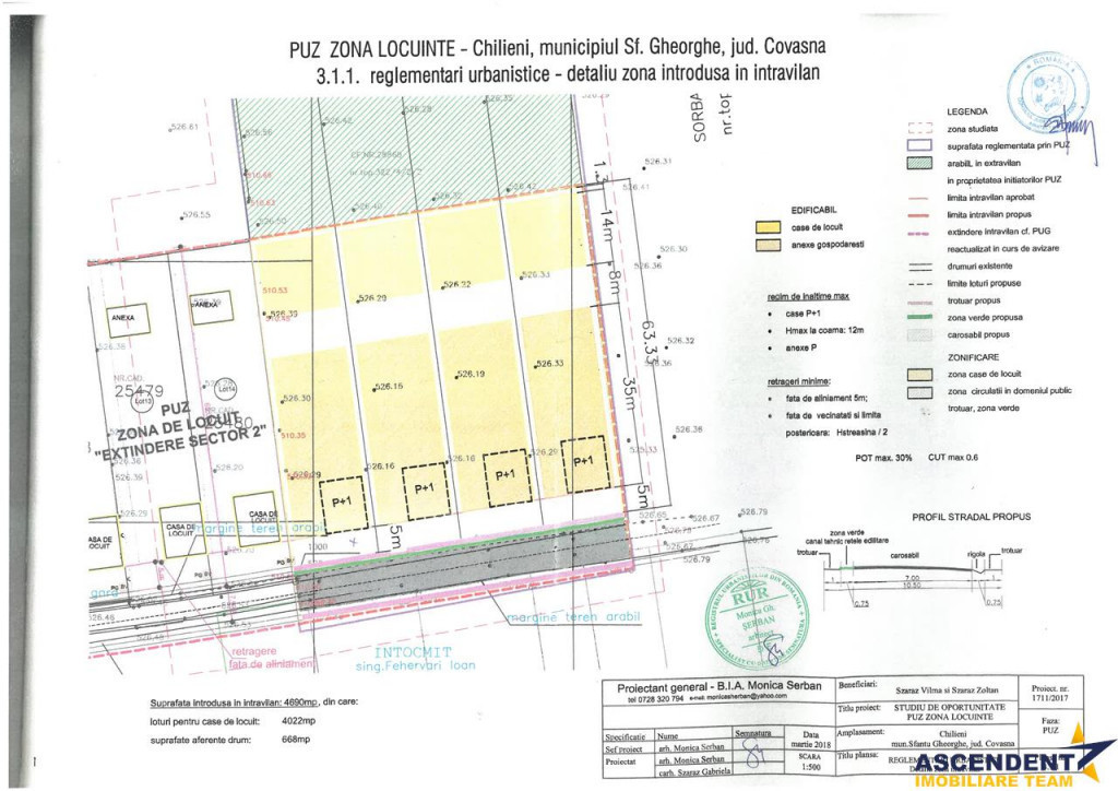 Comision cumparator: 0% ASCENDENT IMOBILIARE COVASNA va propune spre vanzare un teren mixt situat in localitatea Chilieni, la doar 5 km de municipiul Sfantu Gheorghe mdash; un loc unde linistea satului se imbina firesc cu apropierea de oras, oferind acel tip de echilibru pe care il cauta din ce in ce mai multi oameni. Proprietatea are o suprafata totala de 2.493 mp, dintre care 1.038 mp se afla in intravilan, iar 1.455 mp in extravilan. Este un teren generos, cu deschidere de 15,46 m la drum, imprejmuit si prevazut cu poarta, detalii care creeaza din start o delimitare clara si un spatiu usor de personalizat. Pentru o prima vizionare din confortul casei dumneavoastra, va invitam sa urmariti filmul de prezentare pregatit cu drag: https://www.youtube.com/watch?v=NEDDW14dlA4 Zona este linistita si luminoasa, iar accesul rapid catre oras transforma terenul intr-o alegere inspirata atat pentru investitie, cat si pentru dezvoltare rezidentiala. Conform PUZ, se pot construi case de locuit impreuna cu anexe gospodaresti, ceea ce ofera flexibilitate si libertate in configurarea viitorului proiect. Utilitati disponibile: conducta de apa energie electrica Parametri urbanistici: POT maxim: 30% CUT maxim: 0.6 Lotul permite dezvoltarea unei locuinte P 1, cu o inaltime de pana la 12 m, alaturi de anexe pe un singur nivel, oferind flexibilitate an configurarea viitorului proiect. Acesti indicatori fac ca oferta sa fie potrivita pentru constructii moderne, bine proportionate si armonios integrate in peisaj. Fie ca va doriti o locuinta de familie cu spatiu generos, fie un proiect cu potential investitional, terenul din Chilieni ofera cadrul ideal pentru a transforma o idee intr-un plan concret. Pentru detalii suplimentare si programari pentru vizionare, va stam cu drag la dispozitie. Invitam colegii la colaborare ndash; garantam agentului/agentiei partenere onorariul aferent! Consilieri dedicati alesei oferte: Moise Kincso ndash; Telefon/WhatsApp: 0738 691 312 Szentpaly Csilla ndash; Telefon/WhatsApp: 0746 586 904 Detalii, fotografii suplimentare si alte oferte similare exclusive: www.ascendentimobiliare.ro