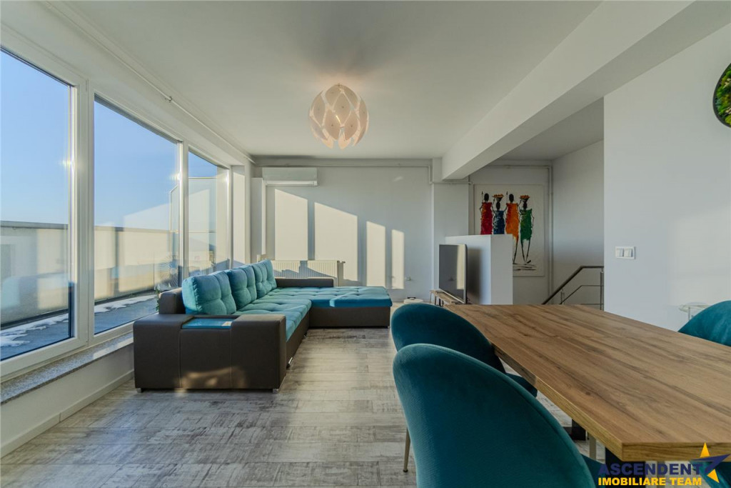 Comision chirias: 50% tva, din contravaloarea unei chirii lunare, o singura data. ASCENDENT IMOBILIARE este onorata sa va prezinte spre Inchiriere o locuinta spectaculoasa, aflata intr-un complex rezidential apreciat, recunoscut pentru confort si calitate, cunoscut sub numele de Maurer Tractoru, Brasov Va invitam sa experimentati o vizionare initiala, din locatia unde va aflati, chiar acum, prin accesarea turului virtual tridimensional: https://my.matterport.com/show/?m=pAcmUTp5wZt Film prezentare: (in porcesare) Proprietatea beneficiaza de o terasa generoasa de aproape 39 mp, cu vedere panoramica si fara vecini directi, oferind intimitate si un autentic sentiment de libertate. Situat la etajul 8 dintr-un bloc cu 9 niveluri, elegantul Penthouse are o suprafata utila de 99 mp, este dotat cu aer conditionat in zonele principale, tamplarie PVC cu geam tripan si o buna izolare termica, certificata prin clasa energetica B Spatiul interior este compartimentat eficient in: living cu bucatarie open space de 39.07 mp, dormitor matrimonial de 17.49 mp, baie cu dus proprie de 5.24 mp, al doilea dormitor de 11.17 mp, al treilea dormitor 12.75 mp, baie secundara cu cada de 3.86 mp si hol scara de 9.22 mp. Rezidenta vine in intampinarea noilor locatari mobilata, utilata si accesorizata partial oferind oportunitatea de a fi personalizata in functie de stilul dorit. Bucataria este echipata cu electrocasnice incorporate, mobilierul este ales in tonuri neutre, iar finisajele sunt atent selectate pentru a crea o atmosfera coerenta, eleganta si primitoare. Proiectat cu atentie pentru un stil de viata modern, complexul dispune de lifturi silentioase, acces securizat prin videointerfon, spatii comune iluminate cu LED si finisaje de calitate superioara. O boxa si un loc de parcare la subsol completeaza pachetul ideal pentru un stil de viata urban, confortabil si eficient. Consilier dedicat pentru aceasta oferte: doamna Stramciuc Florentina Telefon/WhatsApp: 0761730575 Detalii, fotografii suplimentare si alte variante similare exclusive: www.ascendentimobiliare.ro