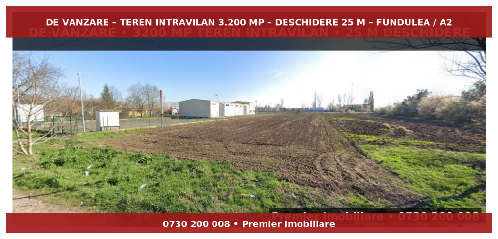 Premier Imobiliare – Agentia Fundulea va ofera spre vanzare un teren intravilan de 3.200 mp in Fundulea, amplasat langa Autostrada A2 (Autostrada Soarelui ) si foarte aproape de Gara CFR Fundulea, cu acces rapid si facil catre Bucuresti, la doar 25 de minute. Situat în Fundulea, într-o zonă mixtă care se dezvoltă rapid, terenul este potrivit pentru o gamă largă de proiecte: dezvoltări de locuințe, depozite logistice, hale industriale sau spații comerciale (service auto, showroom, sediu de firmă). Terenul are o deschidere de 25 m la drum și vizibilitate de 30 m către Autostrada A2(Fundulea), ceea ce asigură acces facil și expunere foarte bună. Utilități disponibile: curent 220V/380V, apă curentă, canalizare. Preț: 44 euro/mp – negociabil. Contactați-ne pentru detalii și vizionare! Cristian Marcu – Premier Imobiliare, Agentia Fundulea Telefon: 0730 200 008