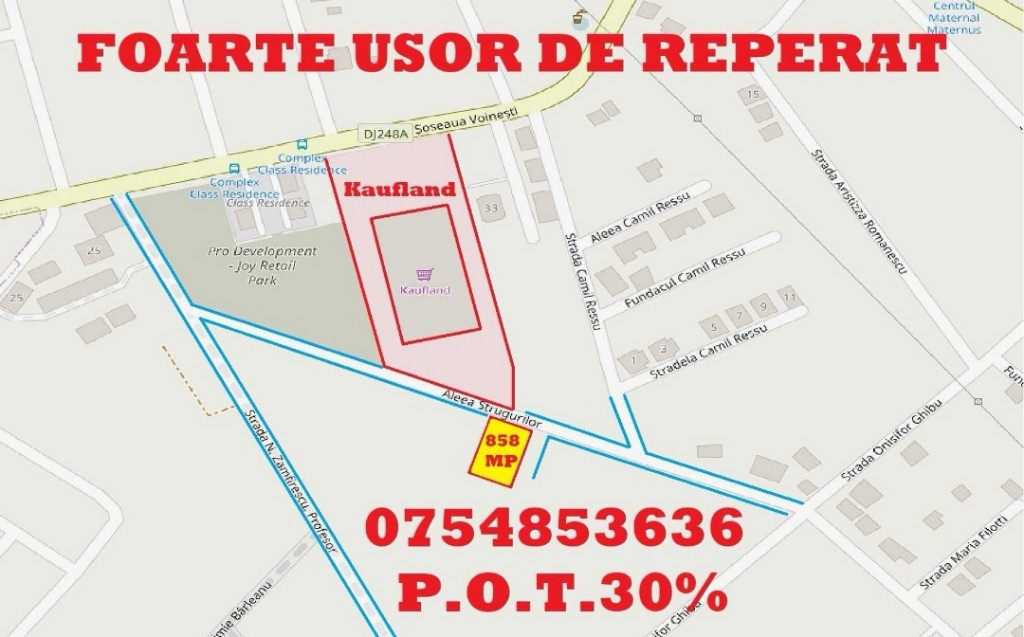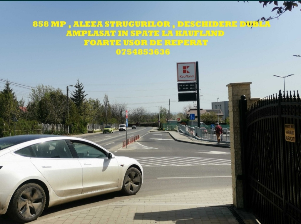 Relații suplimentare la 0754853636. Locație ideală pentru locuit sau dezvoltare afacere. Foarte ușor de reperat! Acte O.K. 858 mp intravilan cu deschidere dublă de 20 metri liniari. 833 mp intravilan, 20 metri de la Aleea Strugurilor! POT 30 %. CUT 0,9. REGIM DE ÎNĂLȚIME 9,8 metri la cornișă. Toate utilitățile în zonă. 190 euro / mp negociabil. Comision negociabil.
