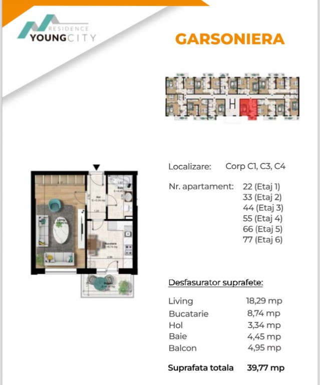 Vand garsoniera decomandata, cu o suprafata de 39.77 mp, situata la etajul 7 in bloc aflat in constructie. Imobilul dispune de incalzire prin pardoseala, kit de aer conditionat si finisaje la alegere. Termenul de finalizare este decembrie 2026. Pretul afisat este pentru plata unui avans de 80% si are tva inclus de 21%. Parcari disponibile exterioare la 6600 euro sau subterane la 8800 euro tva inclus. Mai multe detalii si vizionari la 0739.922.876 Marius Nicolae
