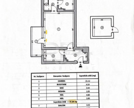 Este alcatuit din living, bucatarie, baie, balcon + o boxa de 7 mp care este trecuta in acte.