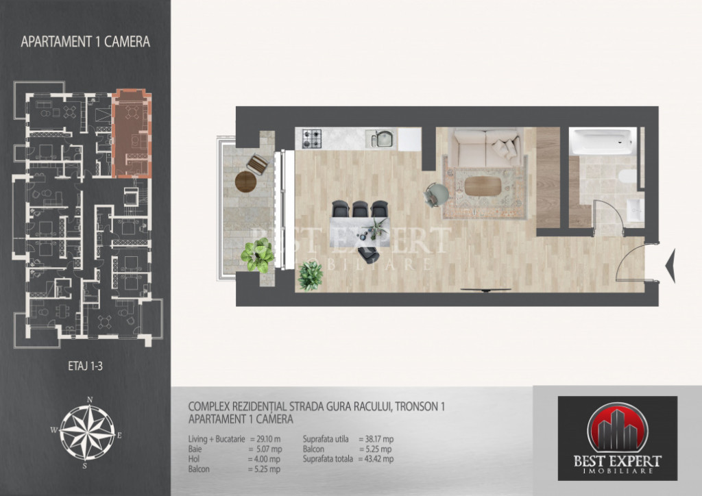 Suprafata utila - 38.17 mp utili +5.25 mp balcon, total 43.42 mp utili