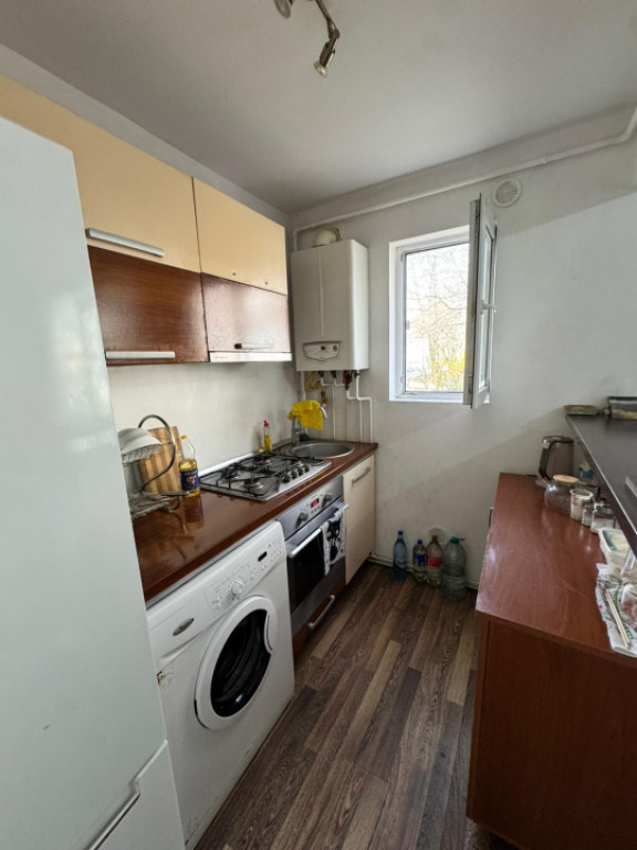 Bucătăria este separată, complet mobilată și utilată, echipată cu aragaz, cuptor, hotă, mașină de spălat rufe și spații suficiente de depozitare. De asemenea, beneficiază de geam pentru aerisire naturală, ceea ce aduce un plus de confort.
