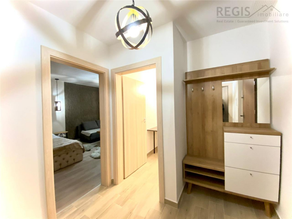 ID intern: 6511 Regis imobiliare va prezinta spre inchiriere o garsoniera moderna situata la etajul 8, in cel mai cautat complex rezidential din Brasov-Urban Plaza. Garsoniera este decomandata, spatioasa si luminata, dispune de pat matrimonial tapitat, canapea comoda, TV si masuta de cafea. Bucataria este complet mobilata si utilata, dispune de vesela si ustensile, cu plita electrica, cuptor, hota, frigider. Baia este moderna complet utilata, prezinta cada cu dus.Balcon spatios, cu masuta si scaune, perfect pentru relaxare. Holul este spatios. Garsoniera mai dispune de o camera tehnica potrivita pentru depozitare si dispune de masina de spalat rufe. Garsoniera dispune de loc de parcare contra cost 50 EUR Conditii de inchiriere: -Chiria 450 EUR/luna -Garantia 450 EUR echivalentul unei luni de chirie Nu se accepta animale de companie iar fumatul se accepta doar pe balcon -Comisionul este 50% TVA din valoarea unei chirii, o singura data. Va asteptam la vizionare! Agent- Bulai Sebastian