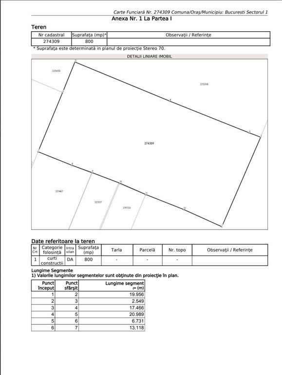 COMISION 0% pentru Cumpărător! Va propun spre vânzare un teren construibil pe Strada Documentului nr. 17, in zona Giulesti ce aparține de Sector 1 București, in apropiere de Baia Giulesti, Biserica Adormirea Maicii Domnului, Școală Gimnaziala nr. 162 si Grădinița nr. 162. Terenul are o suprafață de 800mp, cu un singur front stradal la Strada Documentului de 20ml, terenul fiind un dreptunghi perfect. Regăsiți schița in anunț. Am obținut de curând si un certificat de urbansim de informare, pe care îl pot trimite la solicitarea dvs. Indicatori urbanistici: POT = 45% | CUT = 1,3 | Regim H = P+2 Proprietatea este ideală pentru construcția a 2 duplexuri pentru 2 frați sau 2 prieteni foarte apropiați SAU a unei case individuale care va rămâne cu foarte multă curte. Beneficii: - toate actele sunt la zi, pregătite pentru vanzare - deschiderea de 20ml la strada face posibilă construcția oricărei construcții (in limita reglementarilor urbanismului) - retrasa de la șoseaua principală, fiind penultima proprietatea pana in liniile de tren - proprietatea beneficiază de toate utilitățile (apa, gaz, curent, canal) Pentru mai multe informații, va rog sa mă contactați telefonic: 0769 680 769