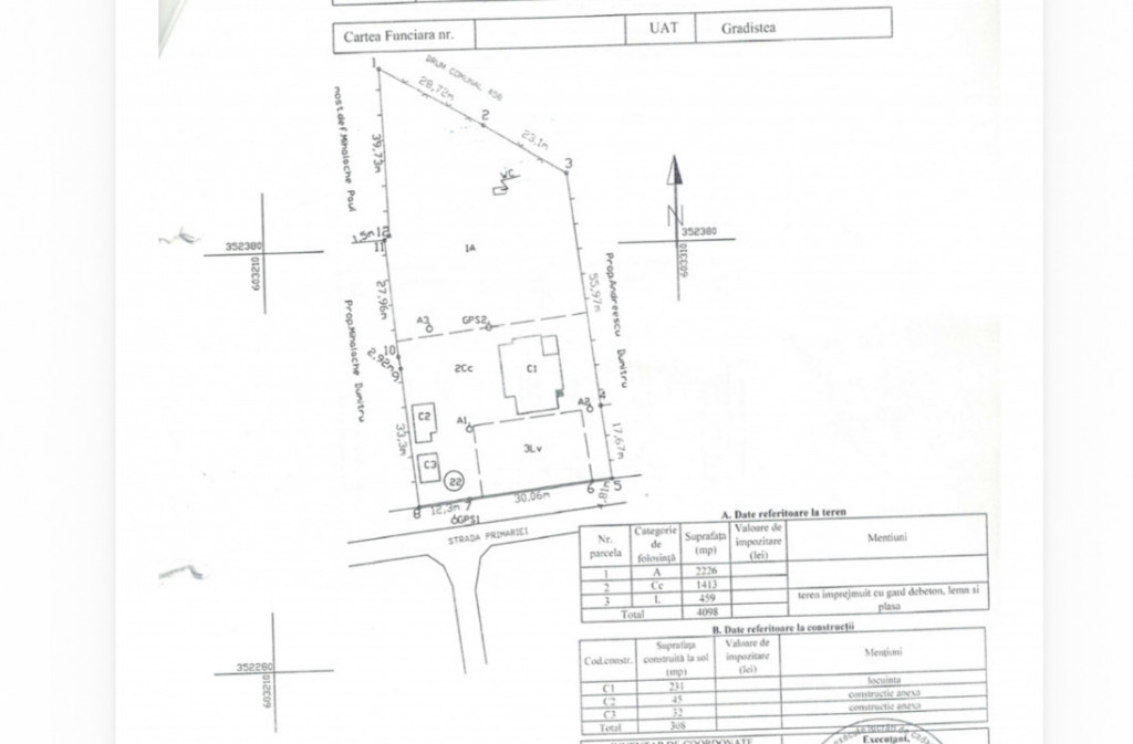 Va oferim spre vanzare o proprietate care se evidențiază prin construcția impunătoare si suprafața generoasă a terenului si apropierea de lac – un adevărat colț de rai. Comuna Gradistea se află în partea de nord-est a județului Ilfov, pe malul râului Vlăsia, în zona unde acesta are confluența cu râul Cociovaliștea si formează lacul Căldărușani. Prin comună trece șoseaua județeană care leagă comuna spre est în județul Ialomița de Fierbinți-Târg, Dridu și Jilavele și spre vest de Moara Vlăsiei (cu acces rapid la autostrada A3), Balotești (unde se intersectează cu DN1), Corbeanca și Buftea (unde se termină în DN1A). Distanța pana in centrul Bucureștiului este de 35 de km. Situatǎ într-o zona cu un puternic caracter turistic și spiritual, această proprietate oferă o oportunitate rară de investiție fiind situata la doar 50 de metri de malul Lacului Căldărușani. Poziționarea este una excelentă, imobilul fiind încadrat de două străzi, aspect care facilitează accesul, organizarea evenimentelor și dezvoltările ulterioare. Zona este recunoscută pentru frumusețea naturală și încărcătura istorică, proprietatea fiind amplasată între Mănăstirea Sitaru și Mănăstirea Căldărușani, două repere de patrimoniu cu tradiție îndelungată, vizitate constant. Întregul cadru este completat de Lacul și Pădurea Căldărușani, oferind liniște, intimitate și un decor ideal pentru evenimente memorabile. Proximitatea față de Snagov și Moara Vlăsiei întărește caracterul exclusivist al zonei. Descriere: Cu o suprafață utilă de 222 mp și o amprentă la sol de 308 mp, suprafata construita este compusă din: - parter cu 7 camere si dependinte in suprafata de 161 mp - beci si pod mansardabil, cu potențial de extindere și recompartimentare - Două construcții suplimentare, situate la intrarea pe teren, cu o suprafață totală de 77 mp, ideale pentru recepție, birouri administrative, spații tehnice sau anexe. Teren ingradit in suprafata de 4.089 mp. Utilități: curent electric, gaz si canalizare la teren, puț. Proprietatea are un mare potential investitional, fiind ideală pentru: -locație de evenimente (nunți, botezuri, evenimente corporate, private dining) -retreat-uri wellness sau spirituale -pensiune boutique / agroturism -centru de recreere -reședință de vacanță premium Va invitam sa descoperiti o proprietate unica, cu personalitate și cu multiple oportunități de dezvoltare, într-un cadru natural deosebit din nordul Capitalei. Id intern: P245901
