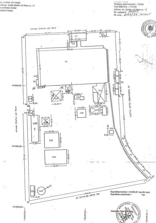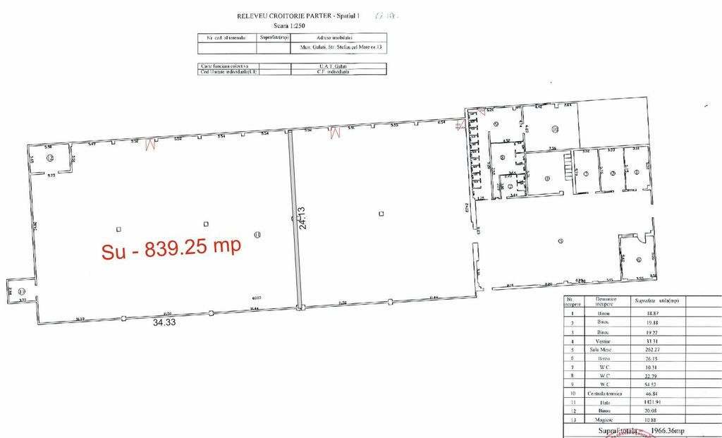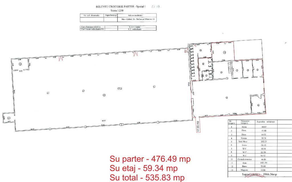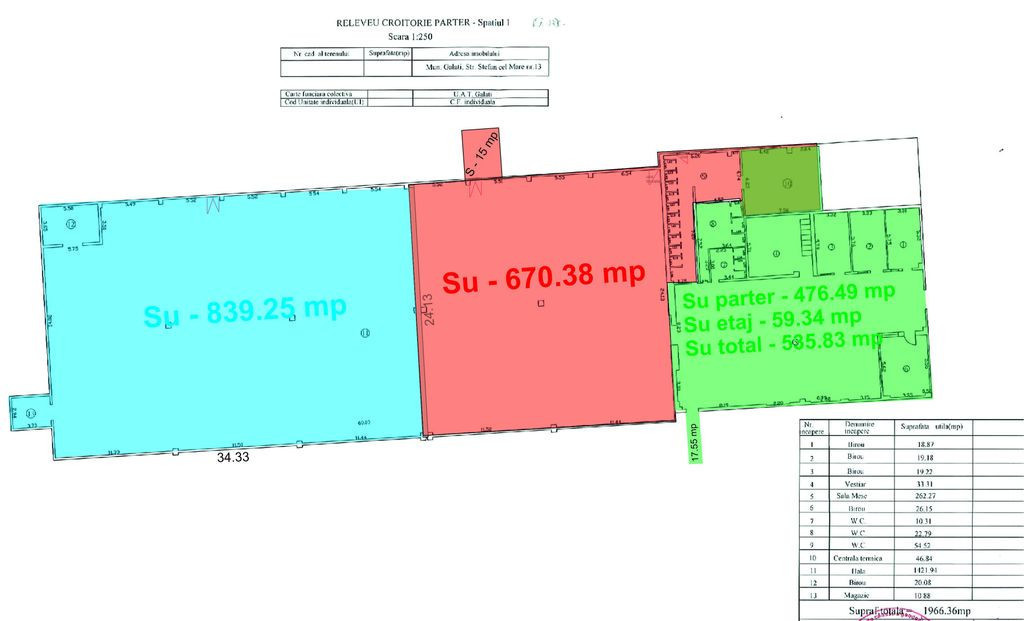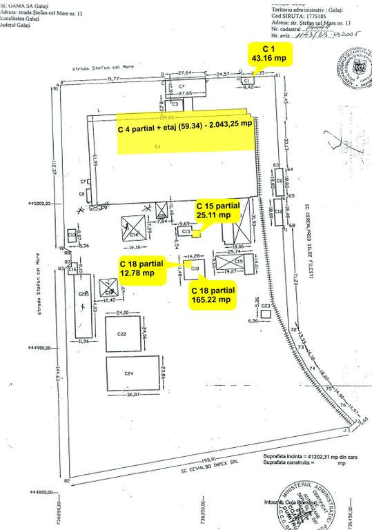 Inchiriem imobile astfel: 1. Spatiu comercial de 43.19 mp; 2. Suprafata de 12.78 mp/25.11 mp/165.22 mp; 3. Suprafata de 535.83 mp - depozit: 476.49 mp si birou - 59.34 mp; 4. Suprafata de 670.38 mp, distanta intre stalpi este de 12 m, inaltimea este de 6 m; 5. Suprafata de 840 mp, distanta intre stalpi este de 12 m, inaltimea este de 6 m; Acces TIR; Post trafo propriu, energie electrica de mare putere; Apa si canalizare.