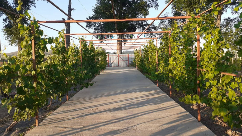 Intrarea pe teren se face de la șosea pe o alee betonata și acoperita de o bolta de vita de vie.