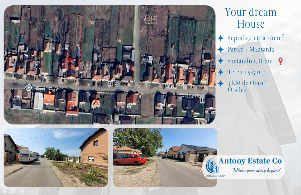 COD: LA House of Memories - casa de vanzare P M, Santandrei, BH, 3 KM Oradea Va propunem spre vanzare o casa P M, independenta, aflata la doar 3 KM de Oradea, in localitatea Santandrei, Bihor. Numele acestei proprietati este: House of Memories. Casa are o suprafata construita de 252 msup2;, iar suprafata utila a acesteia este de 150 msup2;. Imobilul este construit pe un teren in suprafata de 1.553 msup2;, dispunand astfel si de o curte si gradina generoasa. House of Memories este compusa din Parter Mansarda Anexe: 1 living room, 6 dormitoare, 1 bucatarie, 2 bai, 1 terasa, 1 bucatarie de vara, 1 garaj si curte gradina. Plan parter - semifinisat: - 1 living room; - 6 dormitoare; - 1 Bucatarie; - 1 Baie principala; - 1 Casa scarii; - 1 Hol acces; - 1 Terasa intrare, acoperita; - 1 Garaj; - 1 Bucatarie de vara; Constructie din caramida si izolata exterior complet - polistiren exterior. Acoperis tigla. Utilitati: apa, curent trifazic, internet, TV. (completati ce mai are) Se accepta toate modalitatile de plata (integral sau credit). Imobilul este liber de orice sarcini. Oferim clientilor nostri urmatoarele servicii: - Consultanta financiara si juridica; - Consultanta si asistenta in obtinerea creditelor ipotecar-imobiliare; - Echipa de meseriasi (zugrav, instalator, electrician), totul sub contract legal si la termen. - Design interior, asigurari si evaluari proprietati. Antony Estate CO - Where your story begins!