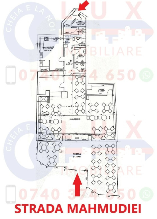 Îți dorești o locație de excepție pentru ați deschide propriul restaurant? Agenția LUX Imobiliare vă oferă, in EXCLUSIVITATE, oportunitatea cumpararii/ inchirierii unui spațiu comercial cu suprafata totala de 209 mp, situat ULTRACENTRAL, pe Strada Mahmudiei, la KM 0 al orasului. Locația spațiului este una de excepție, aceasta fiind situată în inima orașului, aproape de Piața Civică si Faleza Dunării, cu acces stradal. Spațiul este compus din: - Terasa inchisa cu geamuri termopan si tamplarie PVC cu suprafata de 77 mp - Sala de mese - Birou - Bucătărie - Spațiu depozitare - Vestiar - 3 grupuri sanitare pentru personal si clienți Utilitati: apa, energie electrica, canalizare si gaz +++ Aparat de aer conditionat PREȚ 300.000 EURO Contact: 0740 374 650 Marin Nicolae 0756 557 146 Ioana 0744 814 740 Alina E-mail: [email protected] www.agentialuximobiliare.ro Facebook: Agentia Lux / Lux Imobiliare Sediul Agentiei Lux Imobiliare: Strada Babadag, Nr 12, Bl 6, PARTER (vis-a-vis de CEC Bank)