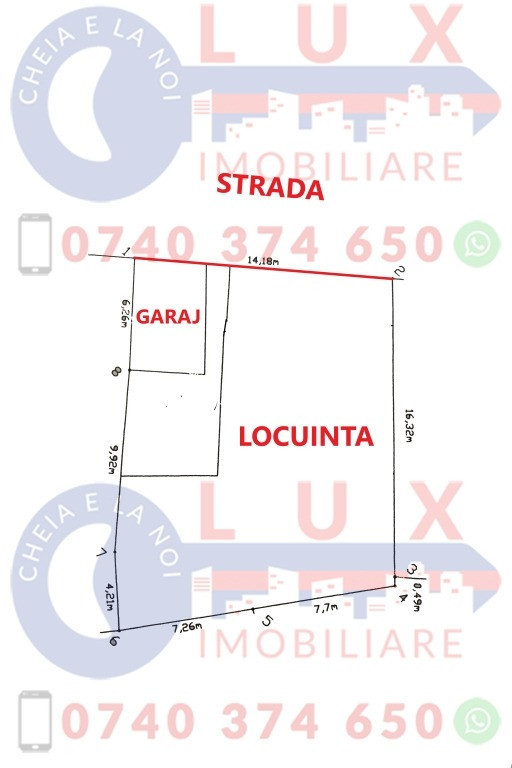 Agentia Lux Imobiliare va propune spre vanzare o casa pe un singur nivel, amplasata in apropierea Strazii Orizontului. Suprafata terenului este de 271 mp si are un front stradal de 14,18 ml. Casa, constructie chirpici, acoperita cu tabla, are suprafata de 193 mp si este compartimentata astfel: 3 holuri, living, 5 dormitoare, spatiu depozitare, 2 bucatarii si 2 grupuri sanitare. Locuinta dispune de 4 intrari. - Incalzirea se face cu centrala termica pe peleti si dispune de sobe de teracota. - Dotari: termoizolata interior-exterior, ferestre si usi cu geam termopan si tamplarie PVC alba, gresie, faianta, parchet, etc - Utilitati: apa curenta, energie electrica si canalizare. ++ GARAJ cu suprafata de 25 mp PRET 95.000 EURO Sună și programează o vizionare! 0740 374 650 Marin Nicolae 0744 814 740 Alina 0756 557 146 Ioana E-mail: [email protected] www.agentialuximobiliare.ro Facebook: Agentia Lux / Lux Imobiliare Sediul Agentiei Lux Imobiliare: Strada Babadag, Nr 12, Bl 6, PARTER (vis-a-vis de CEC Bank) Ne puteti gasi pe INSTAGRAM si pe TIK TOK