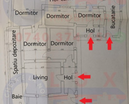 Casa, constructie chirpici, acoperita cu tabla, are suprafata de 193 mp si este compartimentata astfel: 3 holuri, living, 5 dormitoare, spatiu depozitare, 2 bucatarii si 2 grupuri sanitare. Locuinta dispune de 4 intrari.