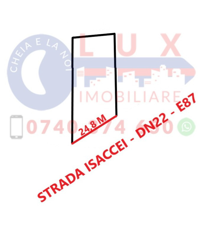 Agentia LUX Imobiliare va ofera spre achizitie un lot de teren in suprafata de 1.000 mp, cu un front stradal de 25 ml la STR ISACCEI – DN22 – E87 ! Amplasarea sa este ideala iar posibilitățile sunt nelimitate. Terenul are un potențial atat rezidential cat si comercial. Este pretabil pentru activitati de depozitare, comert si productie cat si pentru constructie hala, pensiune, parcare ambarcatiuni, spatiu comercial, etc. De asemenea proprietatea este excelentă pentru construictia casei tale! - Destinatia terenului este de INTRAVILAN!!! - Facilitati: • Alte caracteristici: acces auto, la șosea ( STR ISACCEI – DN22 – E87) • Amenajare străzi: asfaltate, iluminat stradal, mijloace de transport în comun • Utilități in apropiere: apă curenta, energie electrica, gaz, canalizare Pret: 100.000 EURO Va asteptam cu drag la Sediul Agentiei Lux Imobiliare - Str. Babadag, Nr 12, Bl 6, PARTER (vis a vis de CEC Bank) Detalii suplimentare la numerele de telefon: Marin Nicolae: 0740 374 650 Alina: 0744 814 740 Ioana: 0756 557 146 [email protected] www.agentialuximobiliare.ro Ne gasiti activi pe FACEBOOK, INSTAGRAM, TIK TOK si YOU TUBE