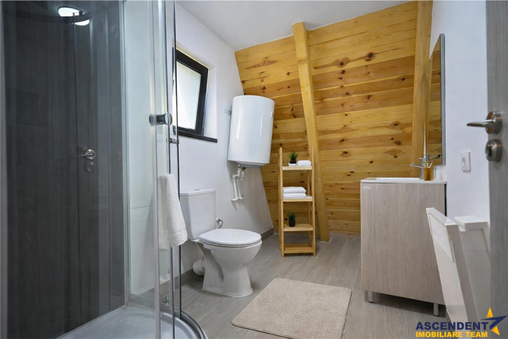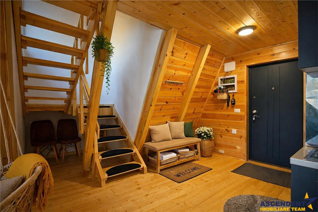 Comision cumparator: 2% TVA, din valoarea de tranzactionare. ASCENDENT IMOBILIARE propune spre vanzare o unitate individuala tip A Frame situata in zona pitoreasca Moieciu de Jos, Brasov, intr-un cadru natural spectaculos, cu privelisti asupra muntilor si a imprejurimilor. Proprietatea se afla pe un teren generos de 1200 mp, cu curte individuala si spatiu liber in proprietate, oferind atat confort si intimitate, cat si posibilitatea de a petrece timp in aer liber intr-un decor natural deosebit. Va invitam sa experimentati o vizionare initiala, din locatia unde va aflati, chiar acum, prin accesarea a filmului de prezentare: Film prezentare: https://www.youtube.com/watch?v=_c2_rVbGvM8 Imobilul a fost finalizat in 2025, construit din beton armat si lemn, combinand rezistenta si durabilitatea cu caldura si estetica materialelor naturale. Suprafata construita este de 63 mp, cu suprafata utila de 71 mp, iar amprenta la sol este de 73 mp, oferind un spatiu eficient si functional, perfect pentru un trai modern in mijlocul naturii. Locuintele beneficiaza de bucatarie mobilata si utilata, baie complet echipata, dormitor si spatii de depozitare, toate gandite pentru confortul zilnic. Fiecare detaliu al casei reflecta atentia pentru calitate si confort: ferestre termopan PVC Veka, izolare interioara, pardoseala din dusumea import, plansee din lemn, balcon si acoperis din tabla Novatik, toate acestea creand un ambient cald si primitor. Casele sunt mobilate si utilate complet, fiind dotate cu aer conditionat, electrocasnice moderne si mobilier de calitate, astfel incat cumparatorul poate intra imediat si se poate bucura de un trai confortabil fara alte investitii suplimentare. Pozitionarea proprietatii ofera liniste, intimitate si acces facil catre principalele atractii turistice ale zonei Bran-Moieciu, fiind ideala atat pentru locuire permanenta, cat si pentru investitie in turism sau inchiriere pe termen scurt. Aceasta reprezinta o oportunitate unica de a achizitiona o proprietate moderna, complet utilata si mobilata, intr-o zona deosebita, cu potential turistic ridicat si un cadru natural deosebit. Pretul expus nu include Tva ul!! Desigur ca particularitatea ofertei si detaliile particulare, ce o configureaza, invita la cunoasterea in detaliu! Consilier dedicat acestei oferte: domnul Florin Tonu 0721 218 273 Detalii, fotografii suplimentare si alte variante exclusive : www.ascendentimobiliare.ro