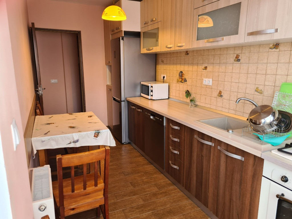 Apartament 2 camere de inchiriat, zona Turnisor, Sibiu. Inchiriez apartament cu 2 camere, situat in localitatea Sibiu, zona Turnisor, aflat la etajul 1, intr-un imobil tip bloc cu regim de inaltime pe Parter + 3 Etaje ; anul constructiei 2008, structura caramida. Suprafata utila de 55 mp + balcon de 6 mp. Avantaje majore ale acestui apartament: Un loc de parcare inclus in pret. Locatie ferita de aglomeratie. Curte interioara inchisa cu telecomanda la poarta pentru auto. Situat pe Calea Turnisorului, aproape de stații de autobuz, magazine, farmacii. Apartamentul este structurat astfel: Hol; Bucatarie cu balcon; Baie; Living; Dormitor Finisajele interioare sunt moderne: Usa intrare: metal; Usi interioare: celulare; Tamplarie ferestre: pvc, termopan; Pereti: vopsea lavabila, faianta; Podele: parchet, gresie. Utilitati si dotari: Utilitati: curent electric, apa, canalizare, gaz, cablu tv, telefon, acces internet, fibra optica; Contorizare: apometre, contor gaz, contor curent electric, contorizare separata; Caracteristici bloc: interfon, acoperis. Apartamentul se inchiriaza complet mobilat si utilat cu: plita pe gaz, cuptor electric, hota, masina de spalat rufe, masina de spalat vase, frigider cu congelator, cuptotr cu microunde. Incalzirea se realizeaza prin centrala proprie.