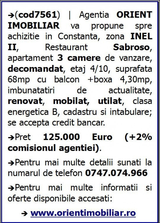 (cod7561) | Agentia ORIENT IMOBILIAR va propune spre achizitie in Constanta, zona INEL II, Restaurant Sabroso, apartament 3 camere de vanzare, decomandat, etaj 4/10, suprafata 68mp cu balcon +boxa 4,30mp, imbunatatiri de actualitate, renovat, mobilat, utilat, clasa energetica B, cadastru si intabulare; se accepta credit bancar. Pret 125.000 Euro (+2% comisionul agentiei). Pentru mai multe detalii sunati la numarul de telefon 0747.074.966.