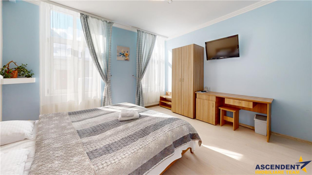Comision chirias: 50% TVA, din contravaloarea unei chirii lunare, o singura data. ASCENDENT IMOBILIARE este onorata sa va propuna spre inchiriere intr-o locatie deosebita, din inima orasului Brasov, o pensiune ce imbina farmecul zonei istorice cu functionalitatea unui spatiu destinat ospitalitatii, aproape de cele mai importante atractii turistice, stradutele pitoresti si atmosfera vibranta a centrului vechi, proprietatea reprezinta o oportunitate unica de investitie. Va invitam sa experimentati o vizionare initiala, din locatia unde va aflati, chiar acum, prin accesarea turului virtual: Tur virtual tridimensional: https://my.matterport.com/show/?m=erjeVYsNKx7 Cu o suprafata utila de 231 mp si o suprafata desfasurata de 500 mp, motelul este structurat pe subsol si parter, avand un pod mansardabil ce ofera posibilitatea de extindere. La subsol se afla un restaurant elegant, cu o capacitate de 70 de persoane, apreciat pentru organizarea de evenimente sau pentru servirea oaspetilor intr-un cadru intim si primitor. Acesta este completat de o bucatarie bine echipata, un bar si doua grupuri sanitare, asigurand toate facilitatile necesare unei experiente culinare de exceptie. La parter, atmosfera calda si rafinata este redata de cele sapte camere, fiecare dotata cu baie proprie, oferind confort si intimitate fiecarui oaspete. Receptia primitoare creeaza o prima impresie placuta, iar spatiile exterioare completeaza farmecul proprietatii. O terasa acoperita ofera un loc relaxant pentru momente de liniste, in timp ce terasa neacoperita, cu o capacitate de 100 de persoane pentru organizarea evenimentelor in aer liber. Pentru un plus de valoare, hostelul beneficiaza de patru locuri de parcare concesionate de la primarie, un aspect esential intr-o zona centrala. In plus, podul mansardabil ofera posibilitatea de a amenaja inca opt unitati de cazare, extinzand astfel capacitatea de primire si maximizand potentialul investitiei. Situata intr-un oras cu un puternic potential turistic, aceast resort ofera o oportunitate excelenta pentru dezvoltarea unei afaceri in domeniul ospitalitatii. Pozitionarea sa avantajoasa, farmecul arhitectural al zonei si accesul facil la principalele puncte de interes contribuie la atractivitatea acestei proprietati, facand o alegere potrivita pentru orice investitor. Desigur ca particularitatile si unicitatea ofertei invita la cunoasterea detailata. Consilieri specializati pe aleasa oferta domnul Constantin Vieriu Telefon/ WhatsApp: 0722 624 161 si domnul Andrei Rusu Telefon/ WhatsApp: 0774 522 546 Detalii, fotografii suplimentare si alte oferte similare exclusive: www.ascendentimobiliare.ro