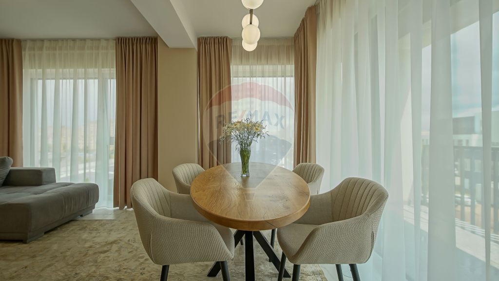 Apartamentul impresionează prin livingul spațios și luminos cu acces către terasă, bucătăria open space complet echipată cu electrocasnice Electrolux, dormitorul generos cu lumină naturală și baia aerisită natural, unde se va monta un panou de sticlă modern. Holul beneficiază de spații inteligente de depozitare încastrate în pereți placați, iar mobilierul de calitate, realizat de Mobexpert și MobiHouse, completează atmosfera elegantă și practică, iar înălțimea camerelor de 2,7 m contribuie la senzația de spațiu și confort.