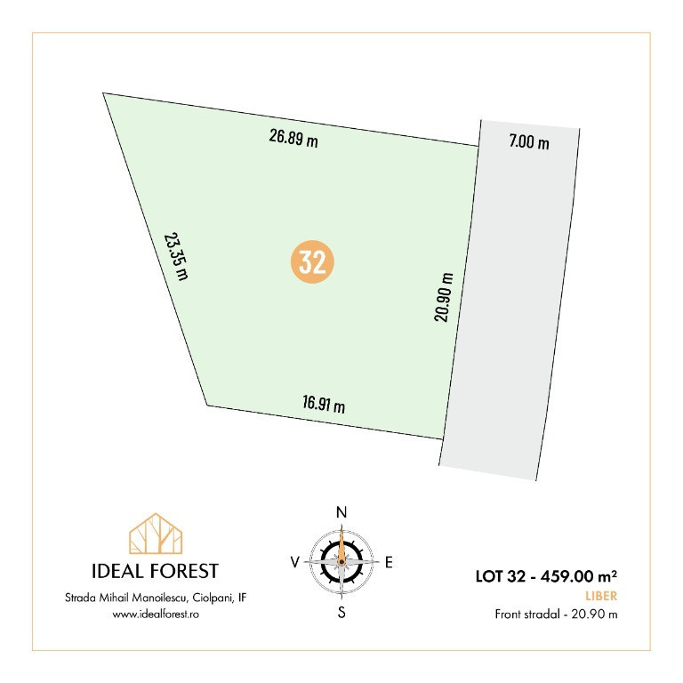 Teren de vanzare lotizat. Situată la o scurtă distanță de București, comuna Ciolpani este atractivă pentru cei care doresc să se bucure de liniște și natură, fără a renunța la facilitățile oferite de un oraș mare. Pădurea Snagov oferă oportunități excelente pentru activități în aer liber, cum ar fi plimbări, drumeții sau ciclism. De asemenea, lacul Snagov este cunoscut pentru frumusețea și posibilitățile variate de agrement pe care le oferă. Pretul afisat este promotional si include canalizare si apa, lucrari efectuate la fiecare parcela doar in incinta complexului, pana la poarta si drumul la nivel de piatra concasata. Specificații : Suprafață utilă – 459.00 m2 Front stradal - 20.90m