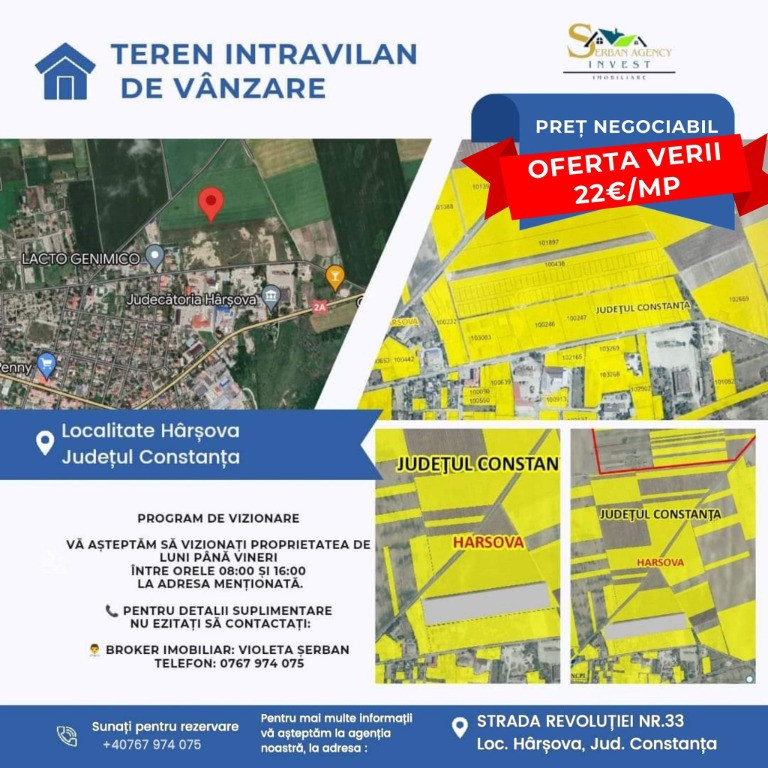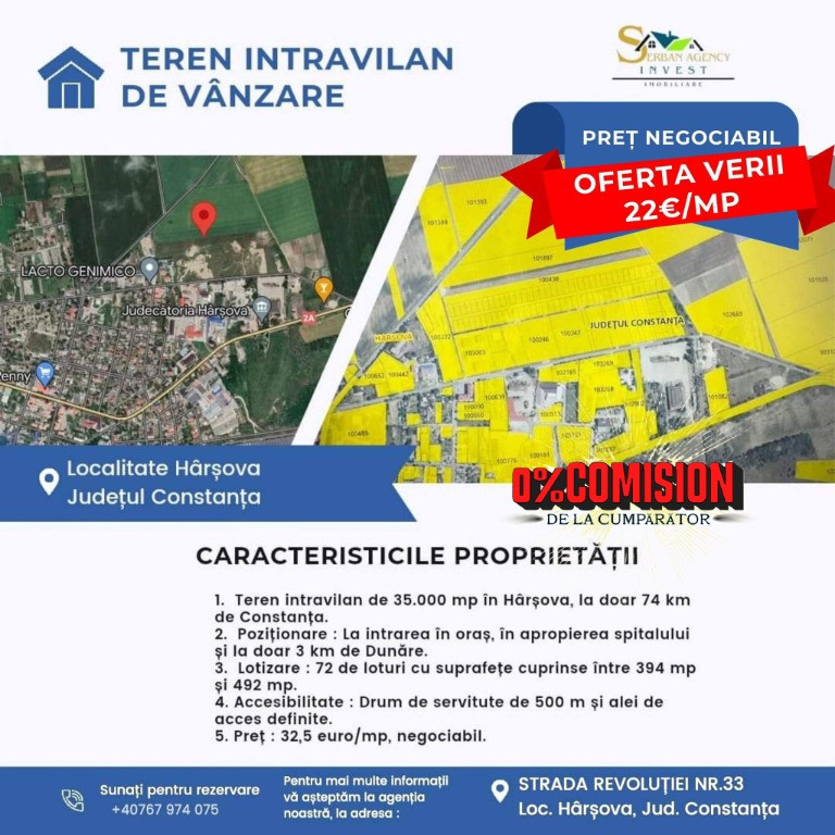 Reducere Specială! Construiește-ți Visul lângă Dunăre – Preț Nou: 20 €/mp! O oportunitate rară te așteaptă! Teren intravilan de 35.000 mp în Hârșova, ideal pentru a crea un cartier vibrant și a te bucura de frumusețea naturală a Dunării! Te-ai gândit să îți faci propria rezidență în aproprierea Dunării? Să ai o oportunitate de a clădii un nou cartier plin de culoare într-un oraș situat pe malul Dunării, plin de obiective turistice istorice si naturale absolut deosebite. Noi ȘerbanAgency Invest Hârșova îți propunem spre vânzare teren intravilan cu o suprafață de 35000mp, în orașul Hârșova la doar 74 km de Constanța. Situat la intrarea în oraș, în aproprierea spitalului, are în vecinătate blocurile ANL și doar 3 km până la Dunăre. Tot terenul este lotizat, suprafața parcelelor fiind cuprinse între 394 mp si 492 mp. În total sunt 72 de loturi + drumul de servitute 500m. Fiecare lot este parcelat în dreptunghi perfect pentru construcția oricărui tip de casă, având și alei de acces definite. Este o ofertă excelentă pentru a da contur visului unui proiect de casă într-un cadru deosebit! Totodată este o ofertă potrivită pentru un dezvoltator imobiliar sau pentru un investitor, pentru achiziționarea întregului lot de 35000 mp. ESTE DE MENȚIONAT CĂ AGENȚIA NU SOLICITĂ COMISION DE LA CUMPĂRĂTOR!