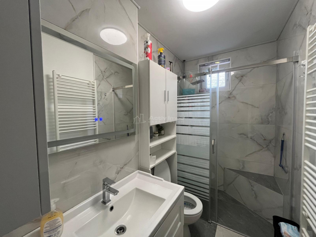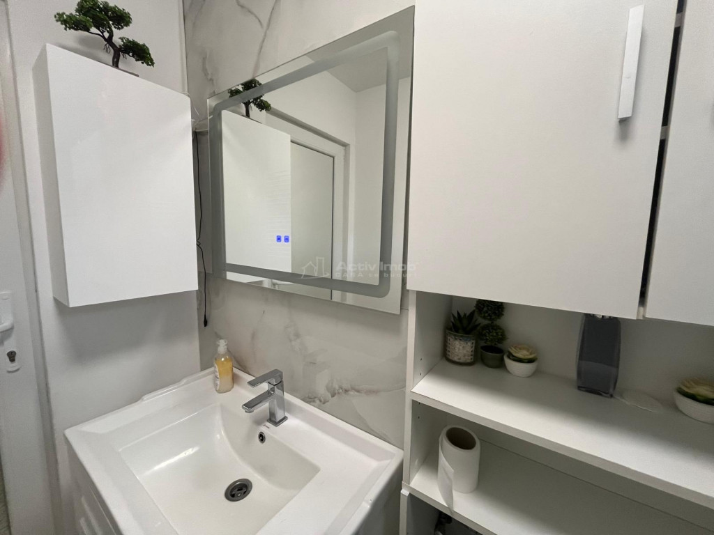 Baia este impecabila, realizata cu finisaje moderne tip marmura, cabina de dus tip walk-in, geam pentru aerisire naturala si oglinda digitala cu touchscreen si iluminare integrata. Un spatiu sofisticat, foarte bine gandit, care transmite curatenie si lux discret.