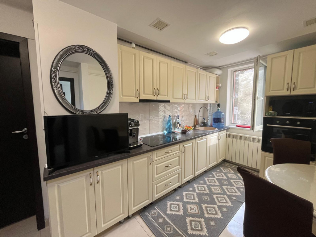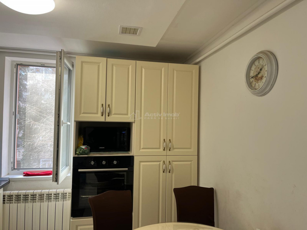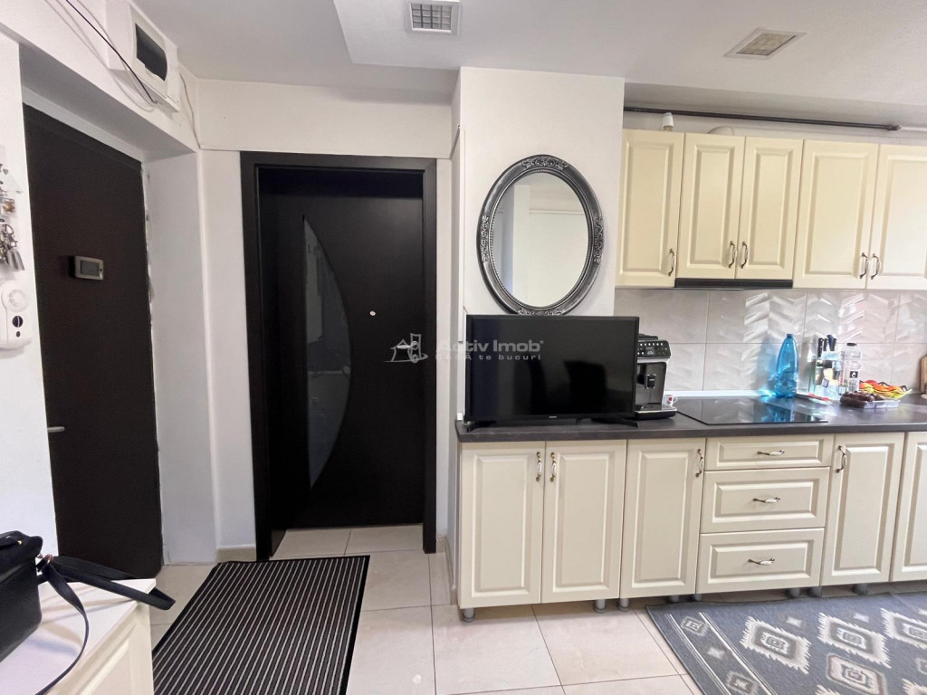 Compartimentarea este semidecomandata, inteligent gandita. Accesul se face direct intr-o bucatarie spatioasa, moderna, complet mobilata si utilata premium. Mobilier elegant, finisaje atent alese, electrocasnice incorporabile de calitate superioara: cuptor, plita, hota, masina de spalat vase, centrala termica mascata discret. Bucataria este finisata cu faianta si gresie moderna si impresioneaza prin luminozitate si functionalitate.