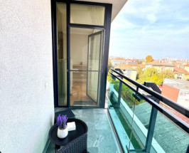Zona de zi, cu bucătărie open-space, oferă o perspectivă amplă și fluidă asupra întregului spațiu, în timp ce balconul dezvăluie o vedere panoramică spectaculoasă asupra orașului, perfectă pentru momente de relaxare.