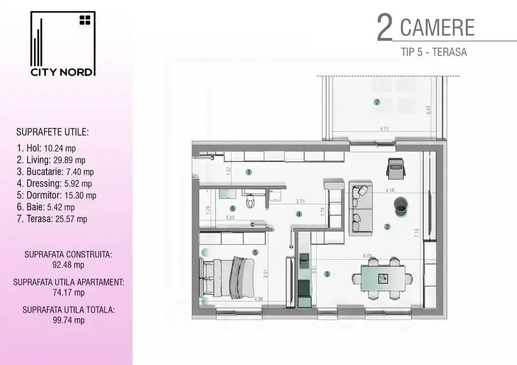 Vă prezentăm un apartament luminos și spațios, situat în ansamblul rezidențial City Nord 1 Decembrie, recunoscut pentru standardele sale ridicate de execuție și pentru comunitatea selectă. Locuința beneficiază de lumină naturală pe tot parcursul zilei, având o orientare ideală și o terasă generoasă de 26 mp – locul perfect pentru relaxare, work-from-home sau seri liniștite în aer liber. Compartimentare și suprafețe utile: Spatiu depozitare-10.24 mp Living-37 mp Dressing-6 mp Dormitor-15.30 mp Baie-5.42 mp Terasa 26 mp Dotări și finisaje premium Apartamentul se predă complet finisat, cu materiale de top Încălzire în pardoseală – Caleffi Tâmplărie Salamander Tripan – 6 camere, 4 sezoane Grup sanitar complet echipat – baterii Roca, cabină de duș walk-in din sticlă Plăci ceramice premium 60×120 Ușă metalică de intrare Porta Uși interioare Porta, celulare, alb mat Centrală termică Saunier Duval Parchet laminat premium 10 mm. Avantaje suplimentare Bloc racordat integral la toate utilitățile publice Lift modern Comision 0% – Direct dezvoltator. VAUNT ID: 106053