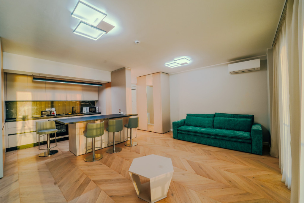 Haus Imobiliare vă prezintă spre închiriere, în stațiunea Mamaia – zona Butoaie, un apartament superb, nou-nouț, aflat la prima închiriere. Apartamentul este compus din 2 camere, compartimentare decomandată, cu bucătărie open-space, living luminos și un dormitor spațios. Beneficiază de finisaje și dotări de lux, fiind complet mobilat și utilat cu mobilier executat la comandă (Yuka Mobili) și electronice de înaltă calitate. Dispune de 2 terase generoase, ambele cu vedere frontală către lac, perfecte pentru a savura apusuri spectaculoase. Baia este modern amenajată, prevăzută cu cabină de duș. Printre îmbunătățiri se numără încălzirea în pardoseală, design elegant, mobilier premium și electrocasnice de top. Apartamentul se închiriază complet mobilat și utilat, gata pentru mutare imediată. ✔ Parcare privată inclusă în preț ✔ Se închiriază pe termen lung ✔ Preț: 1200 EUR/lună (TVA inclus) Id intern: P202744