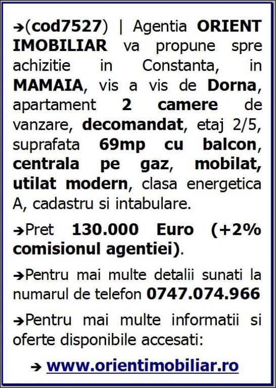 (cod7527) | Agentia ORIENT IMOBILIAR va propune spre achizitie in Constanta, in MAMAIA, vis a vis de Dorna, apartament 2 camere de vanzare, decomandat, etaj 2/5, suprafata 69mp cu balcon, centrala pe gaz, mobilat, utilat modern, clasa energetica A, cadastru si intabulare. Pret 130.000 Euro (+2% comisionul agentiei). Pentru mai multe detalii sunati la numarul de telefon 0747.074.966.