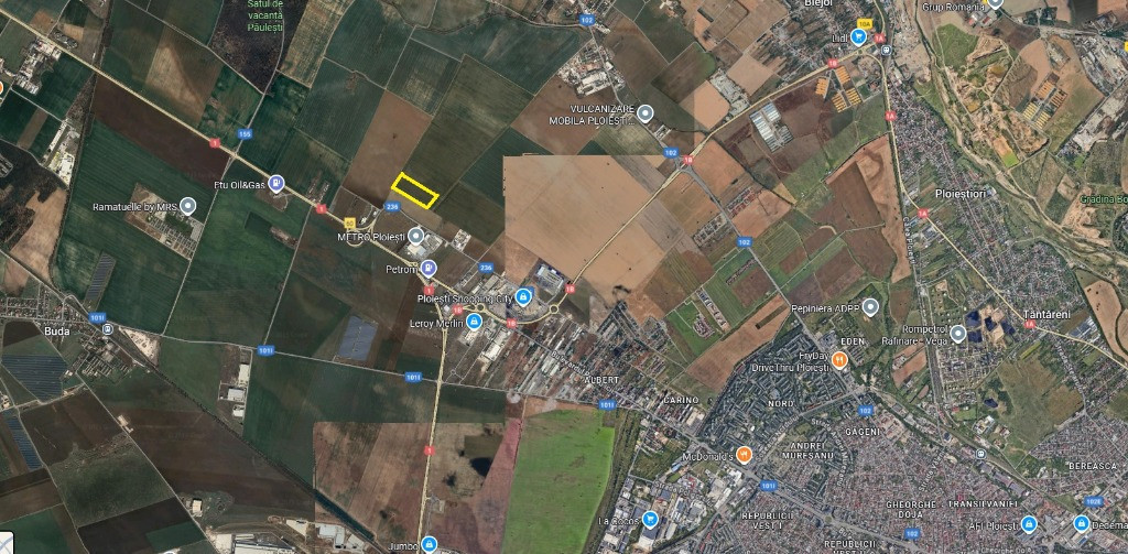 Eurocity Estate va propune spre vanzare un teren extravilan, situat in zona Metro Ploiesti, zona Paulesti, in suprafata de 39.144mp, cu dubla deschidere la 2 drumuri de 105ml si 360ml. Teren se afla in apropiere de DN1, de Metro Ploiesti si Moemax