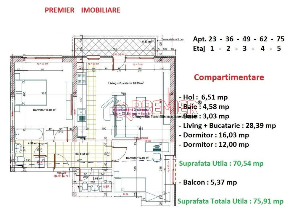 Apartamentul beneficiază de o compartimentare eficientă, cu hol de 6,51 mp, living generos cu bucătărie de 28,39 mp, dormitoare de 16 și 12 mp, două băi de 4,58 mp și 3,03 mp și un balcon de 5,37 mp. Suprafața utilă a locuinței este de 70,54 mp, iar suprafața totală, inclusiv balconul, este de 75,91 mp.