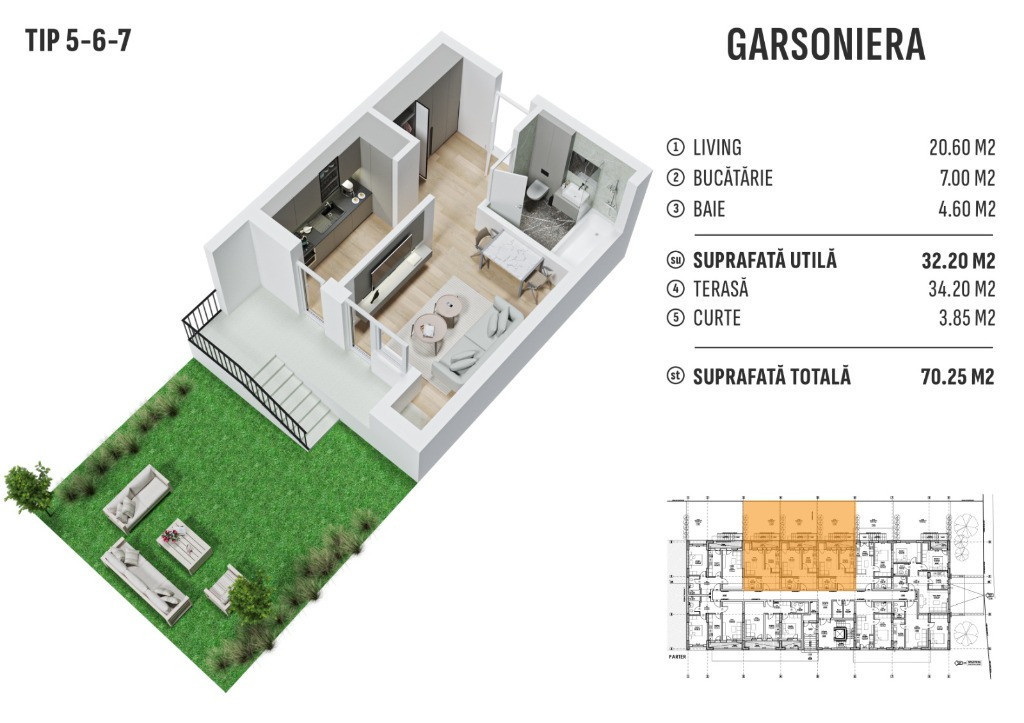 Garsoniera este decomandata, cu o suprafata de 36 mp si gradina aflata in proprietate cu suprafata de 34 mp. Aceasta este alcatuita dintr-o camera, bucatarie spatioasa inchisa, baie ,un hol si terasa de acces in curte cu iesire din dormitor si bucatarie Se preda la cheie, beneficiind de finisaje la alegerea clientului (gresie, faianta, parchet, usi interioare), usa metalica, termopane si racordat la toate utilitatile publice puse la dispozite in zona (apa, canalizare, gaz, energie electrica). Garsoniera se afla intr-un ansamblu rezidential nou construit, dispunand de finisaje moderne si compartimentari ingenioase. Este amplasat intr-o locatie cu acces usor la toate facilitatile zonei, cat si la o distanta rezonabila de mers pe jos fata de statia de Metro Berceni ( aproximativ 15 minute). Pentru detalii si vizionari, va stau la dispozitie. 0739922872 Elena Mache