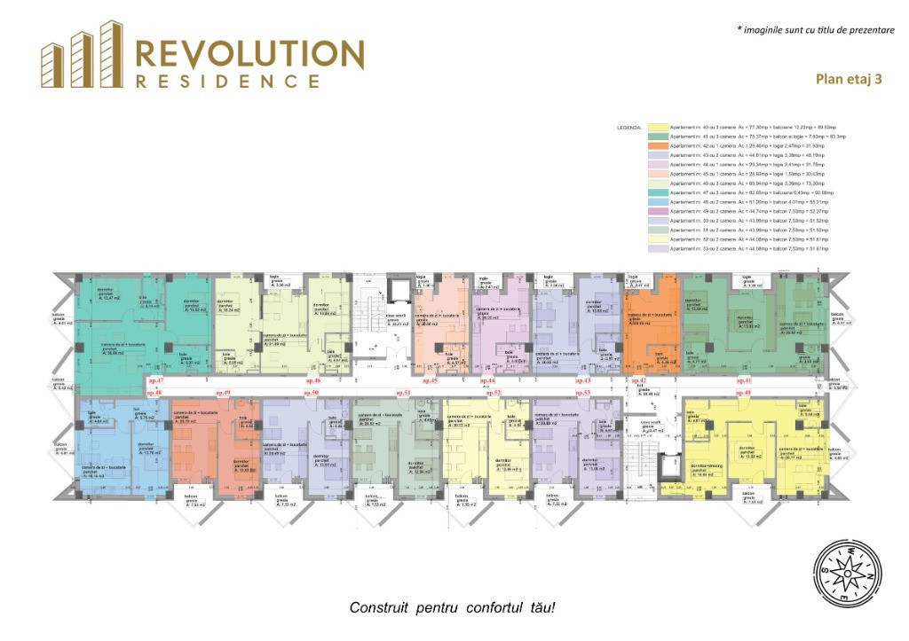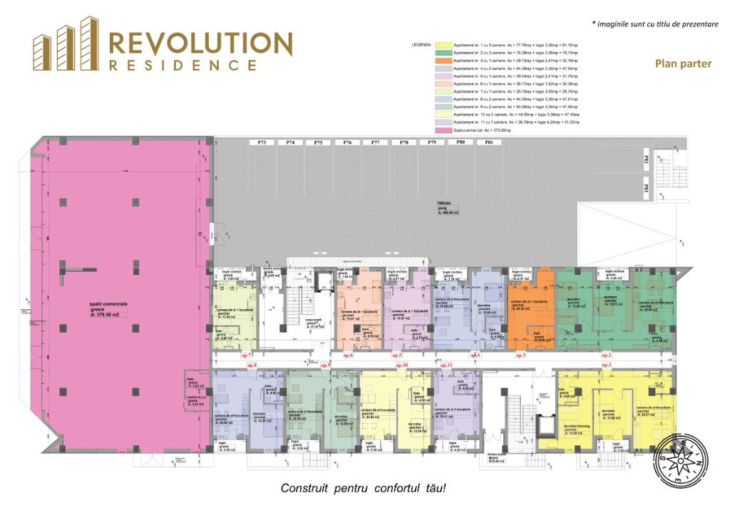 Va propunem spre vanzare apartamente cu 3 camere ce au o suprafata cuprinsa intre 69.94mpc si 100.79 mpc plus terasa cu suprafete cuprinse intre 3.36mpc si 44.03mpc.