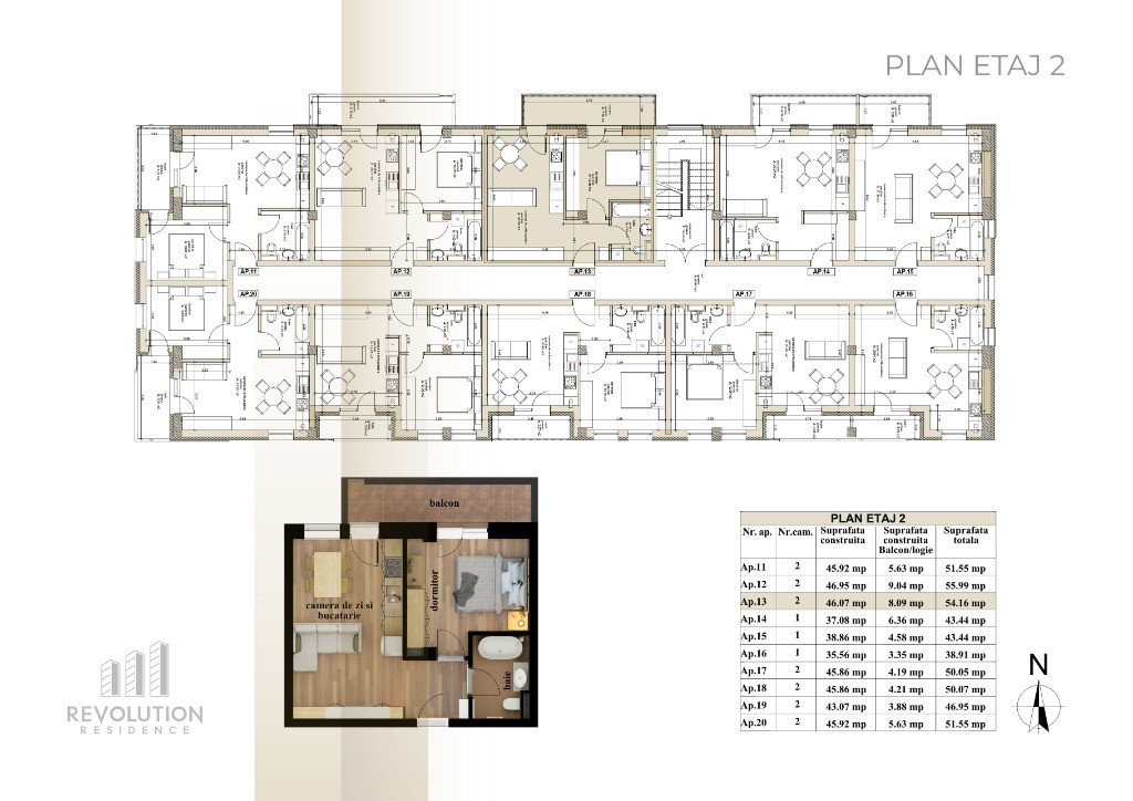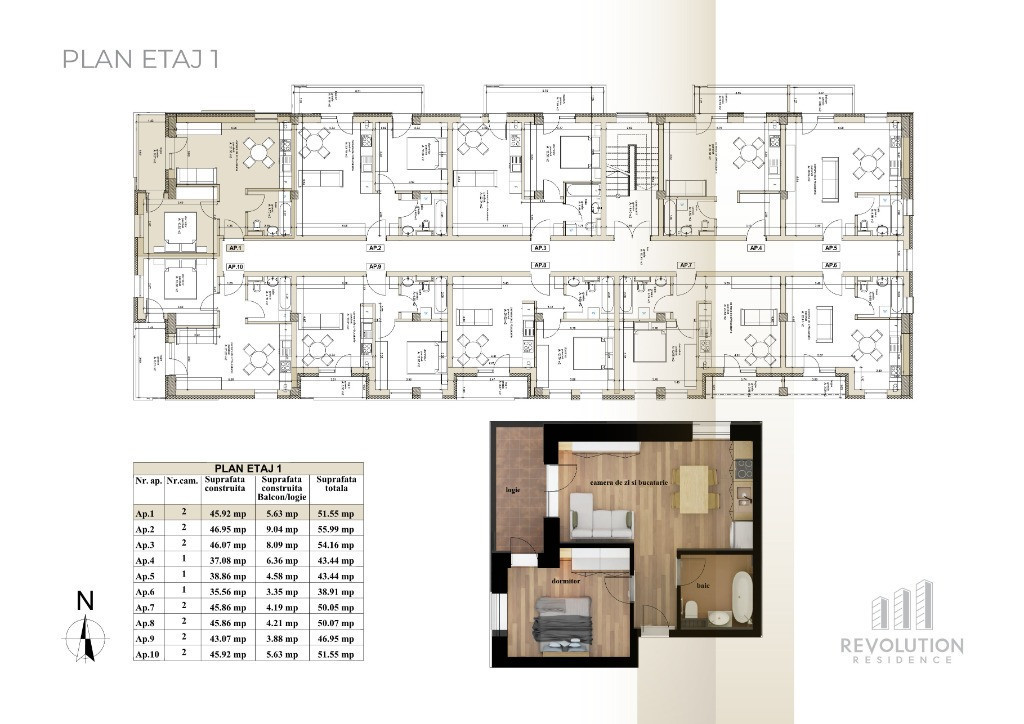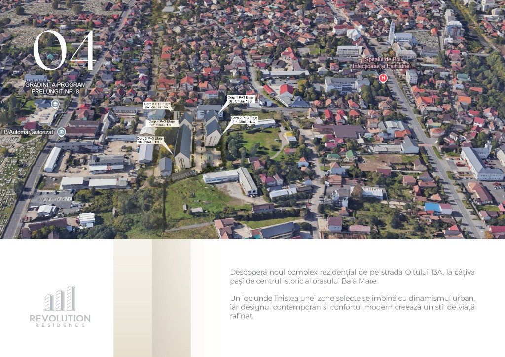 Descopera cel mai nou proiect rezidential de pe str. Oltului nr 13A, din Baia Mare, un proiect marca Revolution Residence. Va propunem spre vanzare apartamente cu 2 camere, avand suprafete cuprinse intre 43.07mpc si 46.95 mpc plus terasa cu suprafata cuprinsa intre 3.88 mpc si 9.04 mpc. Achizitioneaza unul din apartamentele cu 2 camere si beneficiezi de design gratuit pentru amenajarea camerei de baie. Detalii proiect: – Locatie : strada Oltului nr 13A, Baia Mare – Regim de inaltime S+P+3Et si cuprinde un total de 30 unitati de apartamente – Acces facil la mijloacele de transport in comun, restaurante, magazine, mall – Pozitionare excelenta, blocul fiind retras, ferit de agitatia orasului – Standarde ridicate de siguranta si calitate – Design modern – Parcare exterioara – Parcare subterana – Boxe depozitare – Supraveghere video – Spatii comerciale la parter – Imobilul se vinde locuibil, cu instalatie de incalzire prin pardoseala si centrala termica in condensare Facilitati zona: – Supermarket Kaufland, cca 700 m – Statie mijloace de transport in comun, cca 200 m – Restaurant Topaz, cca 550 m – Culte religiase, Adormirea Maicii Domnului, cca 600 m – Scoala Gimnaziala Octavian Goga cca 600 m – Gradinita cu program prelungit nr 8, cca 600 m – Piata Izvoare, cca 900 m – Centrul Vechi, Piata Libertatii, cca 900 m – Spitalul de boli infectioase, cca 500 m – Parcul Regina Maria, cca 1900 m – Campul Tineretului, cca 1700 m – Restaurant Casa Crisan, cca 1500 m – Restaurant Barbarosa, cca 1000 m – Muzeul Judetean de Istorie si Arheologie Maramures, cca 1400 m Preturi incepand de la 1000 Euro/mpc +TVA, care se va aplica conform normelor in vigoare. Pentru mai multe detalii, ne puteti contacta la numarul de telefon 0372.477.477 / 0774.049.796