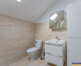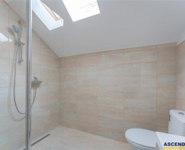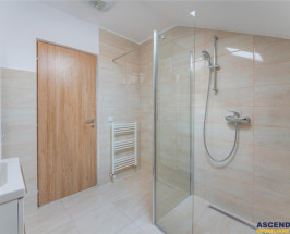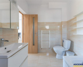 - la parter avem living cu bucatauml;rie open-space, din care se face si accesul pe terasa, dormitor/birou, baie cu cada, spatiile auxiliare, apoi scara interioara care ne poarta spre etaj, unde avem doua dormitoare, deservite de o baie cu dus walk in.