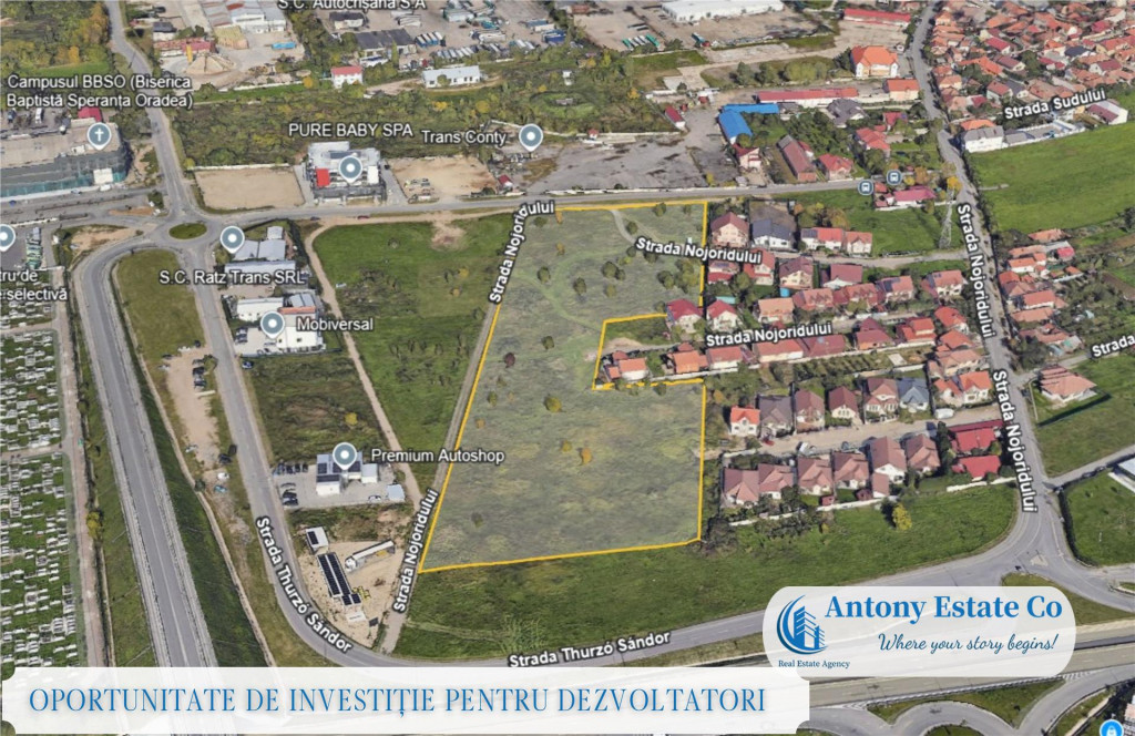 COD: AA OPORTUNITATE DE INVESTITIE PENTRU DEZVOLTATORI IMOBILIARI ! Va propunem spre vanzare in exclusivitate, un teren intravilan cu PUZ si CU, aflat intr-o locatie de maxim interes in localitatea Oradea, Bihor. Suprafata totala cumulata a terenului este de 19#39;600 msup2;, o singura ultima parcela. Pretul terenului este de 95 euro;/msup2;, anume: 1#39;862#39;000 euro; intregul teren de 19#39;600 msup2;. Caracteristici: - Frontul stradal pentru prezentul teren este de 92.88 metri liniari, conform releveu; - Adancimea terenului, pentru prezentul teren este de 264.37 metri liniari, conform releveu; - Planul terenului este drept, la 0 % si este nivelat; - Drumul de acces principal are 7 metri latime, asfalt; - Retea de curent electric si internet, televiziune se afla in proximitatea terenului si nu implica costuri suplimentare majore. Icirc;n proximitatea zonei exista reteaua de gaz, apa si canal. Prezentul teren este liber de orice sarcini, conform CF-ului verificat de catre agentie. Informatiile tehnice au caracter orientativ, acestea fiind preluate de la proprietar. Pentru mai multe detalii si vizionari, ne puteti contacta telefonic la numarul din anunt. Antony Estate CO - Where your story begins!