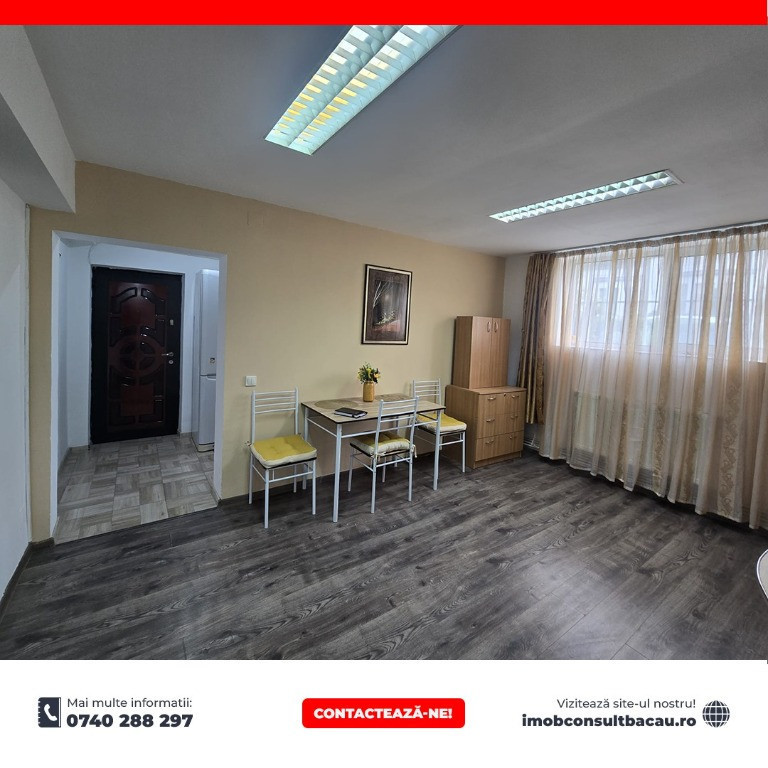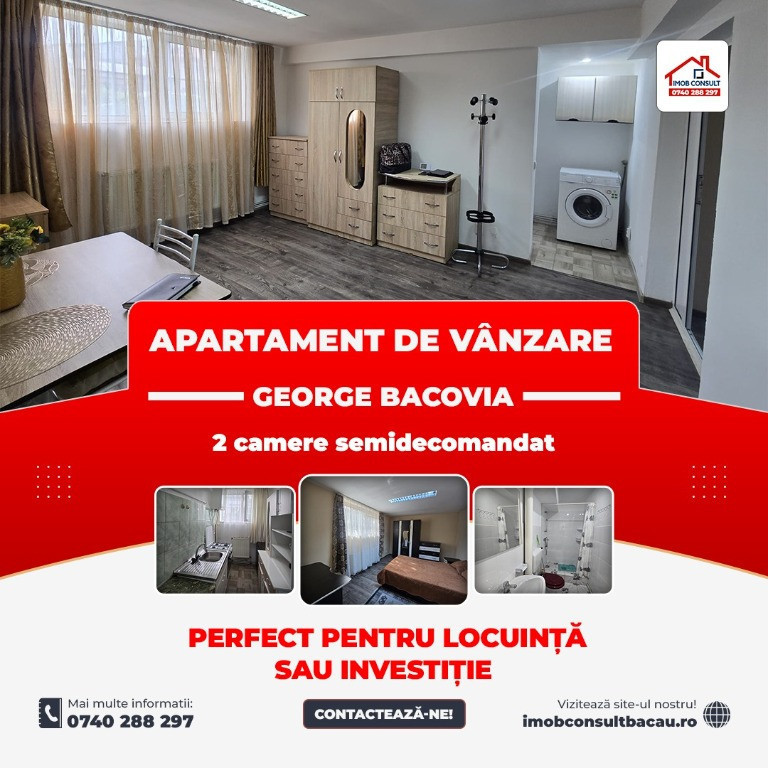Iti doresti un cămin confortabil sau o investiție de succes? Acest apartament cu 2 camere, semidecomandat, este ceea ce cauti! Detalii esentiale: - Strada George Bacovia, Bacău – zonă accesibilă și liniștită. - Demisol confortabil. - Suprafață utilă: 45 mp. - An construcție: 1968 – clădire solidă, bine întreținută. Compartimentare semidecomandată, ideală pentru confort și amenajări personalizate. Acces facil la mijloace de transport, magazine și școli. Perfect pentru locuință sau investiție. Sună acum pentru detalii și programare vizionare! - Costel: 0751 395 002; - Corina: 0740 288 297, sau la sediul agenției noastre, Imob Consult Bacau, situat pe strada Banca Națională nr. 27 la intersecția cu Str. Neagoe Vodă, langa Irish Pub.