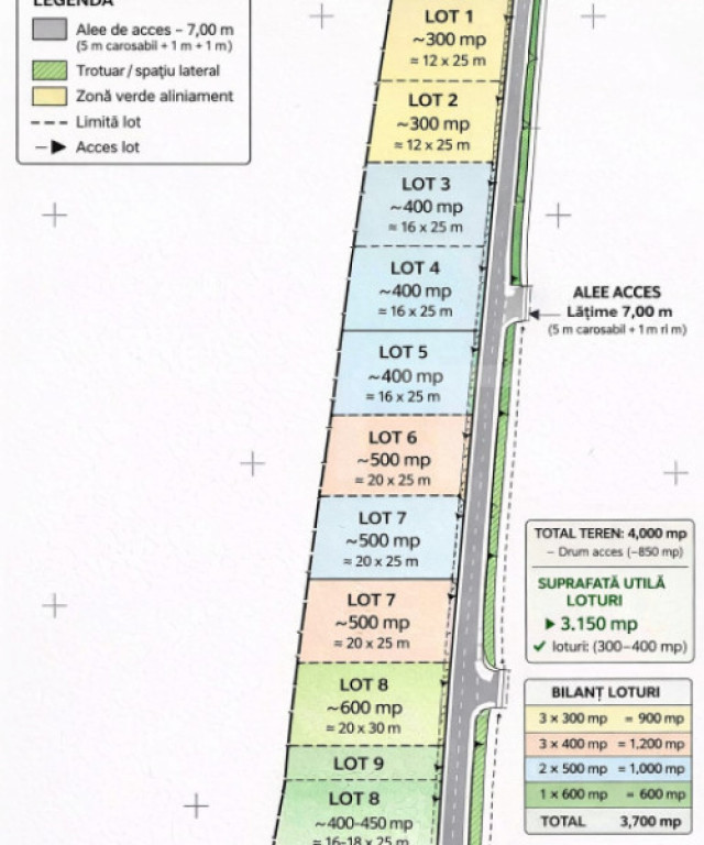 BLITZ ofera spre vanzare, teren intravilan situat în zona Brestei – strada Fulger, cu o suprafață generoasă de aproximativ 4.000 mp, ideal pentru dezvoltare rezidențială. Proprietatea beneficiază de toate utilitățile la stradă (apă, canalizare, energie electrică, gaze), ceea ce reduce semnificativ costurile de dezvoltare și o face perfectă pentru un proiect de lotizare sau construcții individuale. Deschiderea la stradă este de 4 ml, cu posibilitate de amenajare a unui drum de acces interior, conform unei propuneri de parcelare deja realizate, care permite obținerea mai multor loturi cu suprafețe între 300 și 600 mp. Terenul are o formă avantajoasă pentru dezvoltare în profunzime, fiind potrivit atât pentru investitori, cât și pentru dezvoltatori care urmăresc valorificarea rapidă prin parcelare și revânzare. Prețul este unul foarte competitiv raportat la zonă și la potențialul terenului, reprezentând o oportunitate excelentă de investiție. Cod ofertă / ID BLITZ: P169882 Id intern: P169882