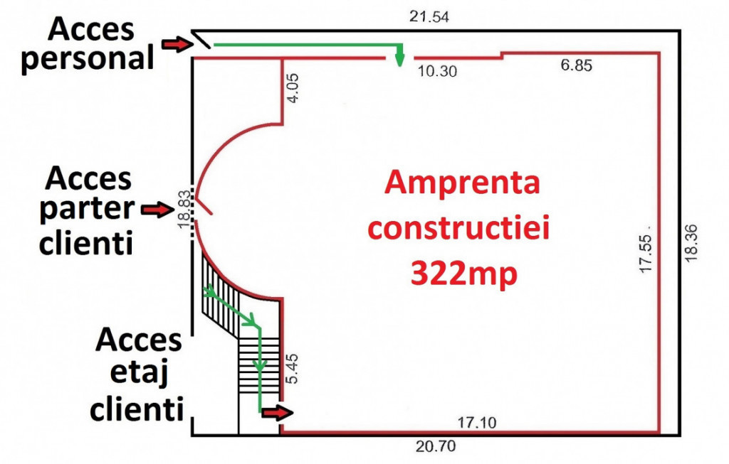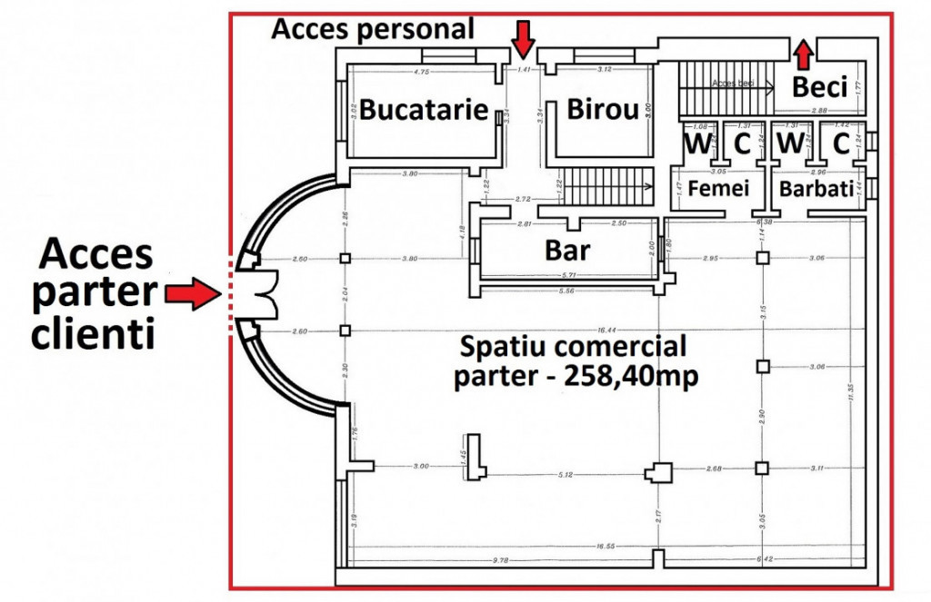 Va oferim spre inchiriere un spatiu comercial situat la parter in zona centrala a orasului Ovidiu (Str. Poiana Nr. 22 colt cu Str. Poporului – zona cu trafic auto si pietonal intens), in suprafata utila de 258,40mp. In cazul in care activitatea chiriasului necesita extinderea suprafetelor, proprietatea dispune de un beci de 26,23mp (pentru depozitare) si de etaj cu dublu acces in suprafata de 281mp (suprafata utila totala 565,63mp). Cladirea de tip S+P+E se poate inchiria partial sau total in functie de necesitate, iar chiria va fi stabilita in functie de suprafetele dorite. Proprietatea a fost construita in anul 1990 din BCA pe structura independenta din cadre beton armat (fara zidarie portanta), pe un teren in suprafata totala de 411mp (amprenta constructiei la sol 322mp) si dispune de urmatoarele dotari si finisaje : gresie, faianta, pardoseli placate cu marmura, termopan PVC integral, placaje cu piatra naturala, placaje cu lambriu si lemn, balustrade inox, instalatii electrice cupru, instalatie pentru sistem de alarma realizata, instalatii sanitare PPR, obiecte sanitare in cele 2 grupuri sanitate de la parter (femei - barbati), instalatii termice cupru, instalatie gaze naturale 2 focuri (unul pentru aragaz si unul pentru centrala termica), acoperis invelit cu tigla metalica montata in sistem asterial termoizolat cu polistiren si placat cu rigips iar caldura si apa calda este asigurata de centrala termica pe gaz 35KW. Datorita compartimentarii interioare care suporta recompartimentari (in mare parte open space), proprietatea poate fi utilizata cu diverse destinatii dupa cum ar fi : bar/restaurant/catering/autoservire, showroom (mobila, materiale de constructii/finisaje, obiecte sanitare/centrale termice, electronice/electrocasnice etc), clinica medicala/cabinete, gradinita/afterschool, magazin alimentar, sedii firma si altele. Pret inchiriere parter 258,40mp 2000€/luna Pret inchiriere S+P+E 565,63mp 3500€/luna La data semnarii contractului de inchiriere, se solicita plata in avans pe doua luni, din care contravaloarea chiriei pe o luna reprezinta suma de garantie (suma ce se elibereaza la finalul perioadei contractuale, dupa plata integrala a utilitatilor si predarea imobilului in conditii bune pentru utilizare). Id intern: P137