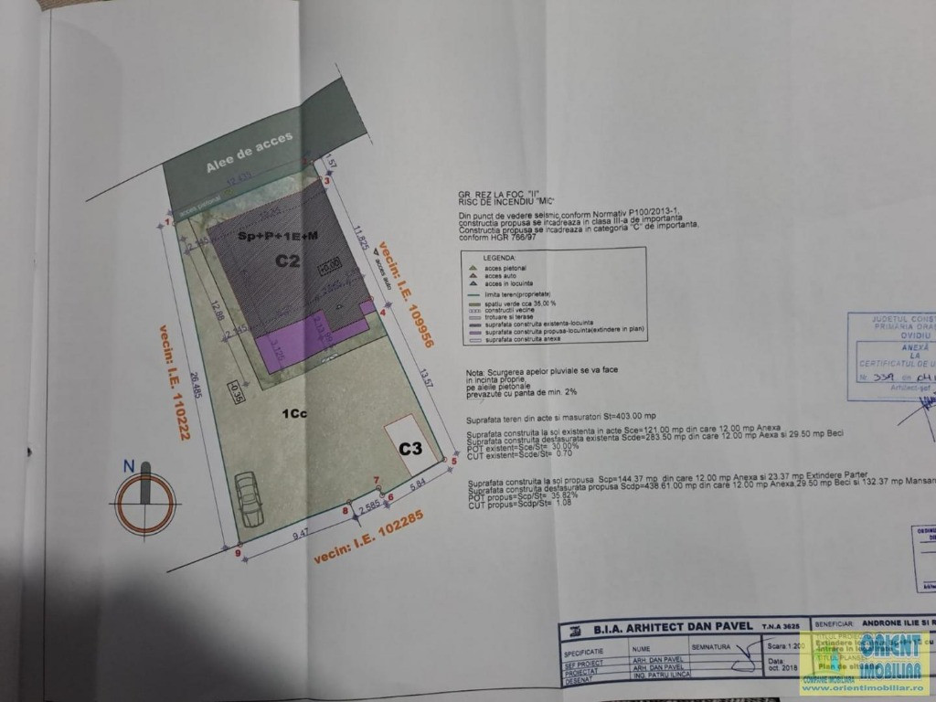 (cod7102) | OVIDIU, vila S+P+1E+M, zona FALEZA, CARTIERUL DE VILE, constructie BCA, finalizata 2020, suprafata teren 403mp, suprafata construita la sol 121mp. Vila este compusa din 3 apartamente: PARTER: living+3 dormitoare, baie, terasa; ETAJ 1: living +2 dormitoare+baie+bucatarie; MANSARDA: living+bucatarie, 2 dormitoare +baie+ terasa. Apartamentele sunt finalizate, dotate cu centrala termica, usi interioare, gresie, faianta, parchet laminat, aer conditionat. Fiecare apartament are intrare separata, scara finisata. Vila este acoperita cu tigla metalica, risc seismic grad IV. Vila se vinde partial mobilata, ideal pentru locuinta 2, 3 familii sau pentru diverse activitati: gradinita, after school, azil, etc. Acte, cadastru si intabulare, curte, foisor, loc parcare 2 masini. Pret 370.000 Euro (+2% comisionul agentiei). Pentru mai multe detalii sunati la numarul de telefon 0745.504.883. Anunt publicat de agentia ORIENT IMOBILIAR.