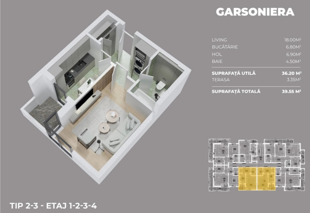 Garsonieră 36 mp – Parc Laurențiu Raiciu Acces atât din Drumul Fermei, cât și din Laurențiu Raiciu, în imediata apropiere a noului parc. Suprafață: 36 mp Etaj intermediar Termen finalizare: Iulie 2026 Preț: 61.900 € cash 65.400 € prin credit Parcare: 7.000 € + TVA Ideală pentru locuit sau investiție, într-un ansamblu modern și o comunitate tânără! 0739 922 870