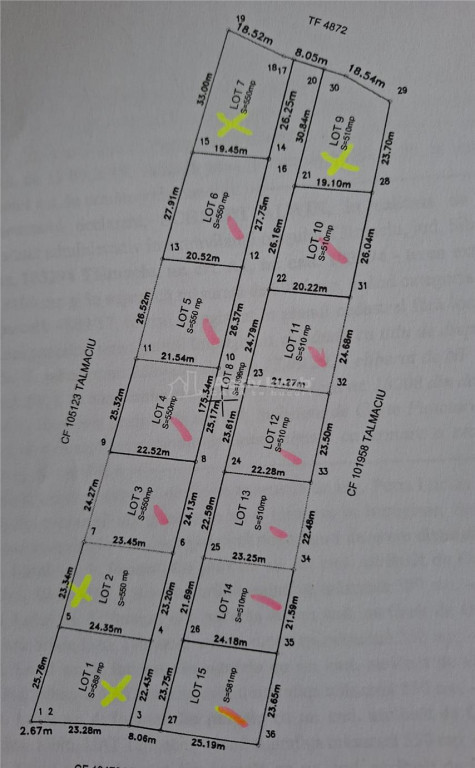 Teren extravilan la liziera padurii, in zona de cabane ndash; Talmaciu Va propun spre vanzare doua parcele de teren situate intre iazuri, intr-un cadru natural deosebit, ideal pentru relaxare sau investitie. Parcela 1: 510 mp 100 mp cale de acces ndash; 19.500 euro Parcela 2: 550 mp 100 mp cale de acces ndash; 20.800 euro Zona ofera liniste si intimitate, fiind compusa exclusiv din cabane, chiar la marginea padurii. Se poate alege orice parcela disponibila din fotografie, dintre cele care nu sunt marcate cu X. Pentru detalii suplimentare, va stau la dispozitie. ID oferta : 231836 CASA TE BUCURI!
